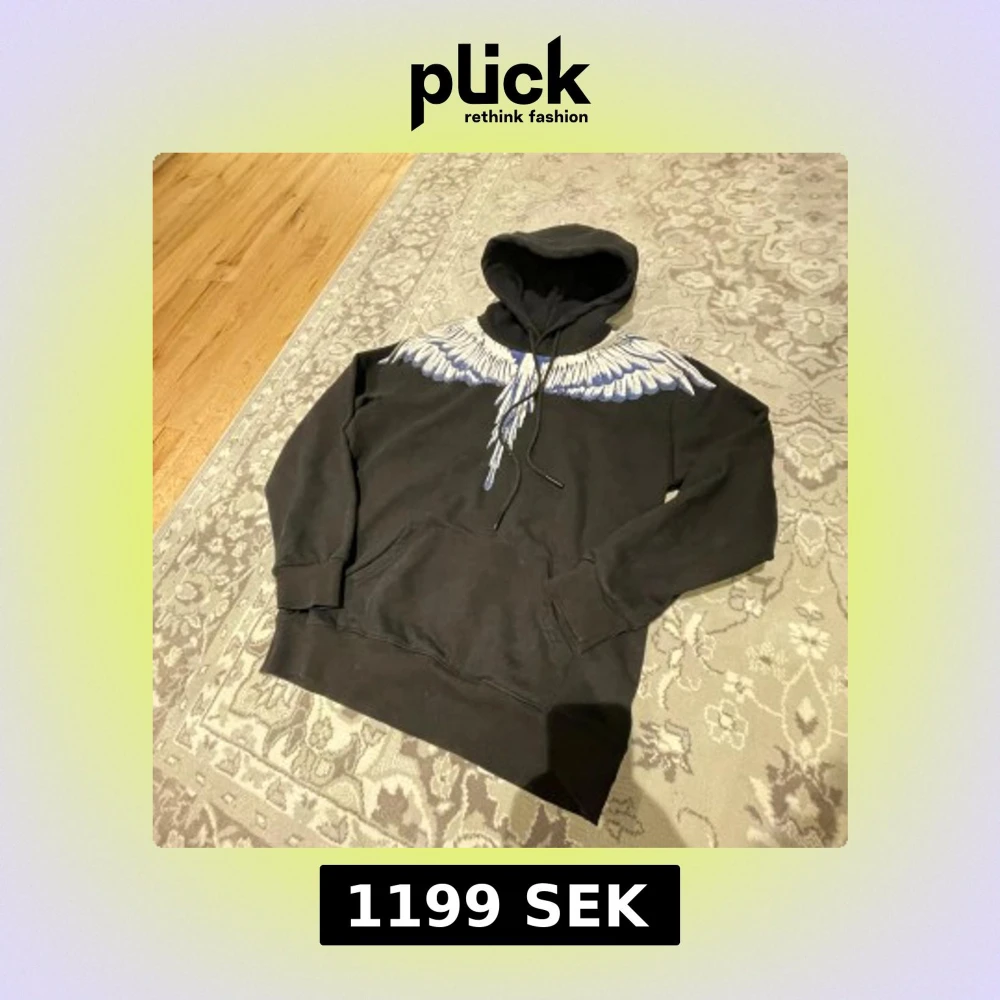 Säljer en svart hoodie från Marcelo Burlon med ett iögonfallande vitt och blått vingmönster över axlarna. Tröjan har en klassisk känguruficka och justerbar huva med snören. Perfekt för en stilren och unik look.