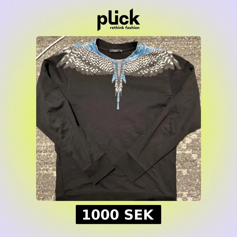 Säljer en svart tröja från Marcelo Burlon med ett coolt vingmönster i blått och grått runt halsen. Tröjan är långärmad och tillverkad i 100% bomull. Perfekt för dig som vill ha en unik stil! 🖤💙