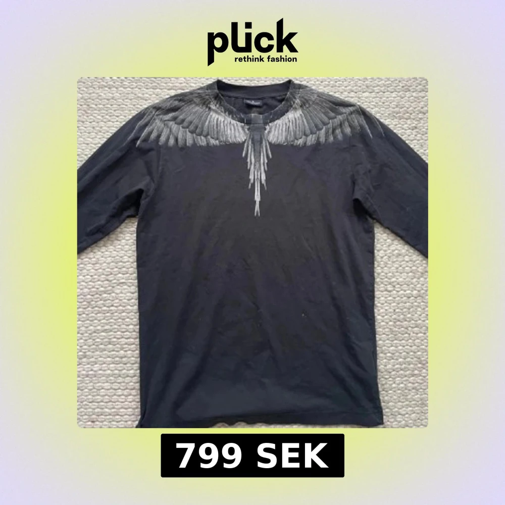 Storlek S sitter mer som M. Svart äkta långärmad tröja från Marcelo Burlon med ikoniskt fjädermönster i grått runt halsen och axlarna, både fram och bak. Tröjan är gjord i mjuk bomull och har en normal passform.