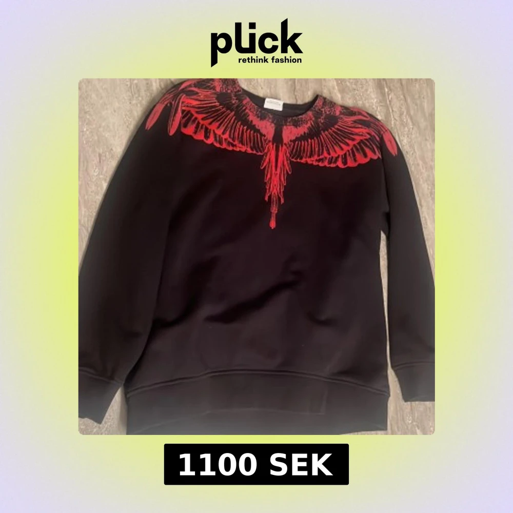 Säljer en svart tröja från Marcelo Burlon med en cool röd vingdesign runt halsen. Tröjan har långa ärmar och är tillverkad i 100% bomull. Perfekt för dig som vill ha en unik och stilren look. Storleken är XL men den sitter som L
