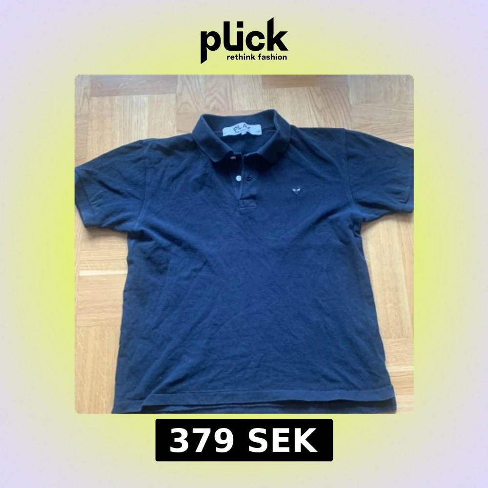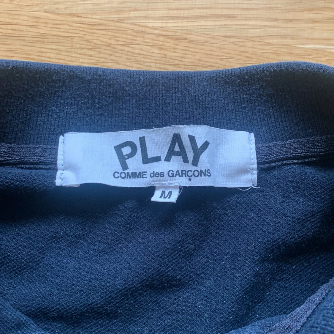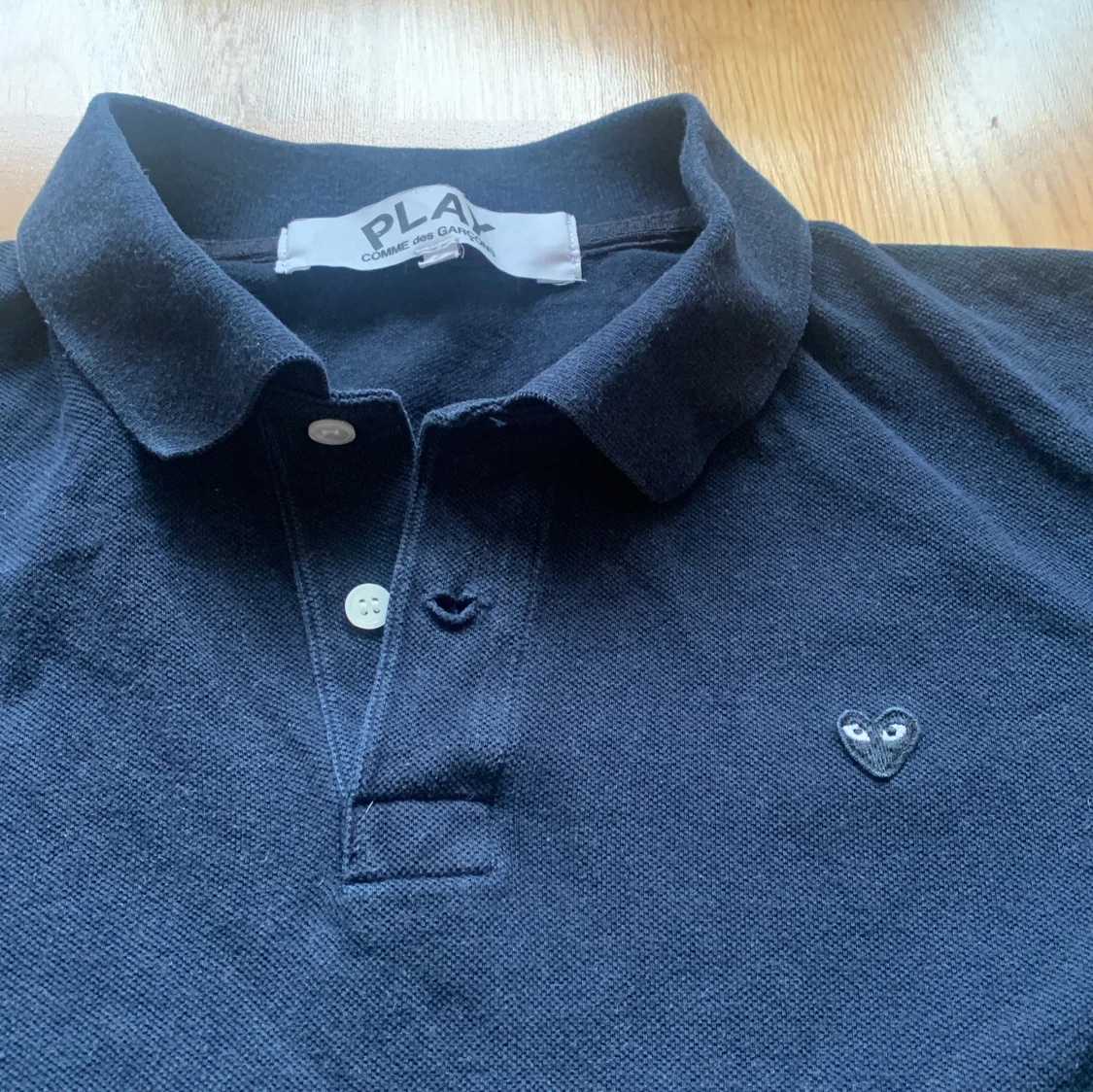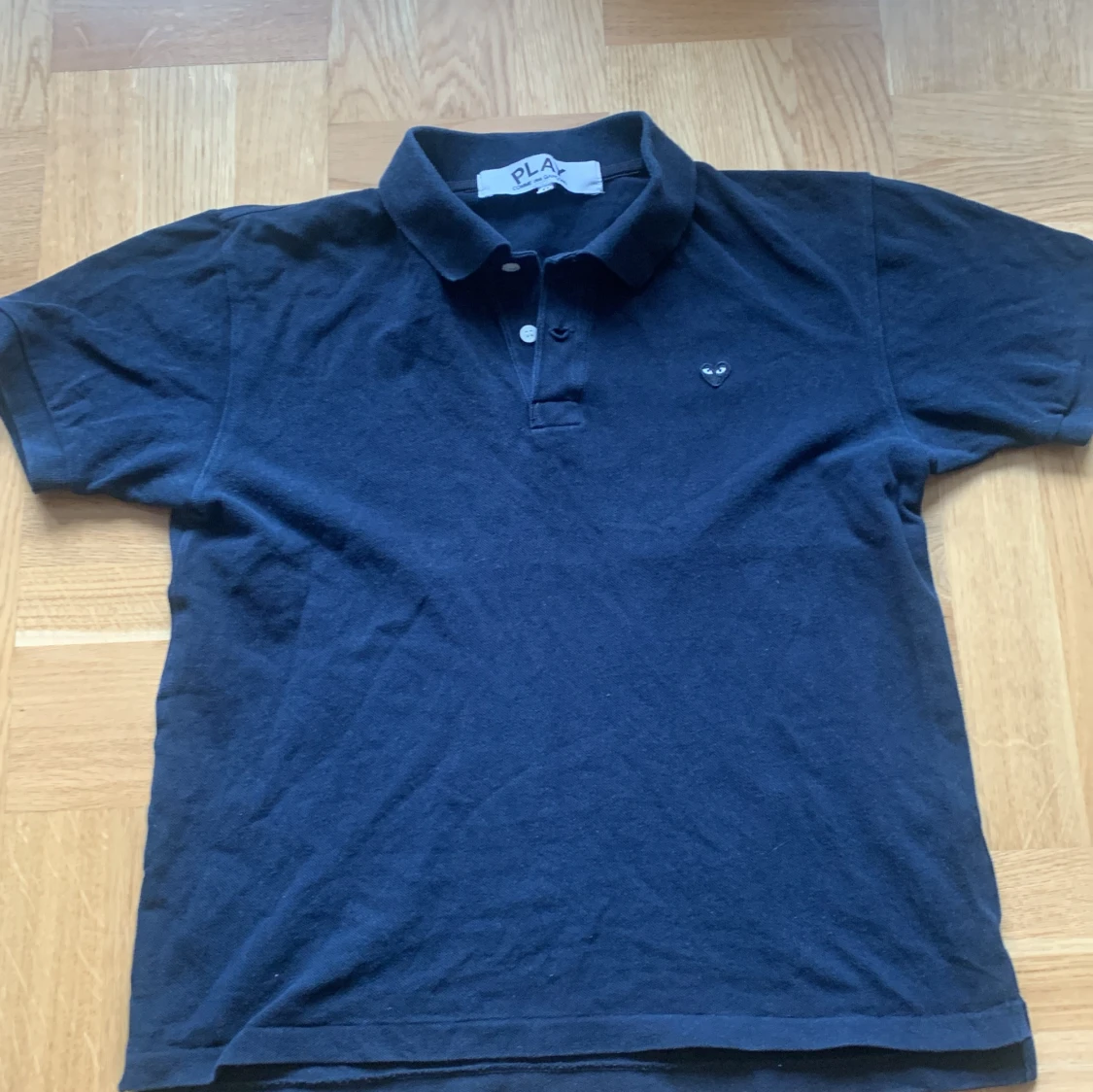Säljer en svart pikétröja från Comme des Garçons Play med klassisk krage och två knappar framtill. Tröjan har det ikoniska hjärte-logotypen broderad på bröstet. Perfekt för en stilren och avslappnad look.