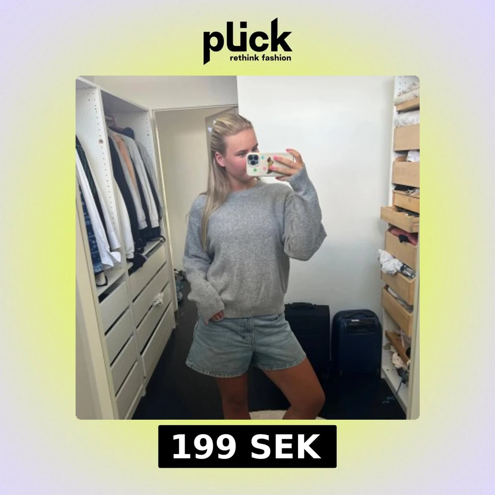 Mysig grå stickad tröja med rund hals och långa ärmar. Tröjan har en loose passform och ribbade muddar vid ärmslut och nederkant. Perfekt att slänga på sig när det är kyligt ute. Enkel och stilren design som funkar till allt. Mini fläck på bröstet (sista bild)