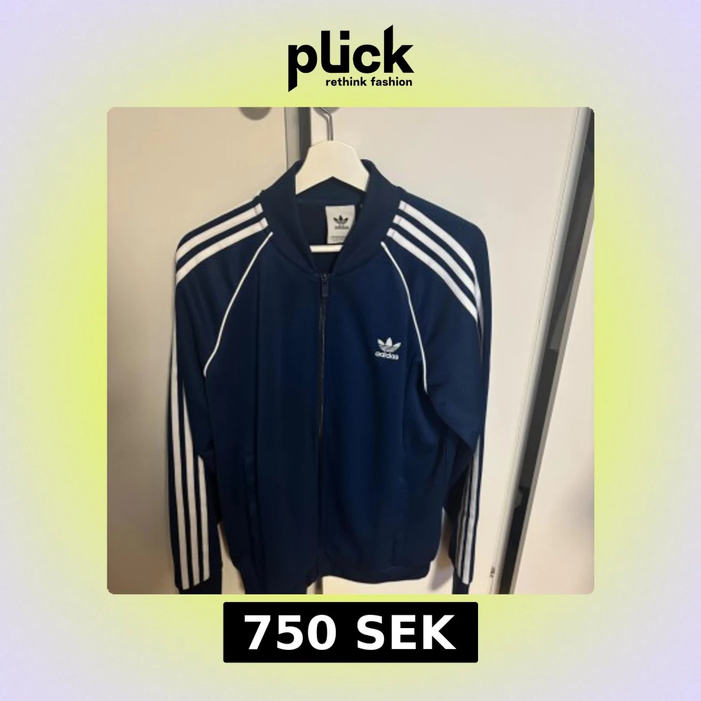 Säljer en marinblå Adidas zip-tröja med klassiska vita ränder längs ärmarna och Adidas-logga på bröstet. Tröjan har lång ärm, ribbad krage och dragkedja framtill. Perfekt för chill eller sportiga dagar.
