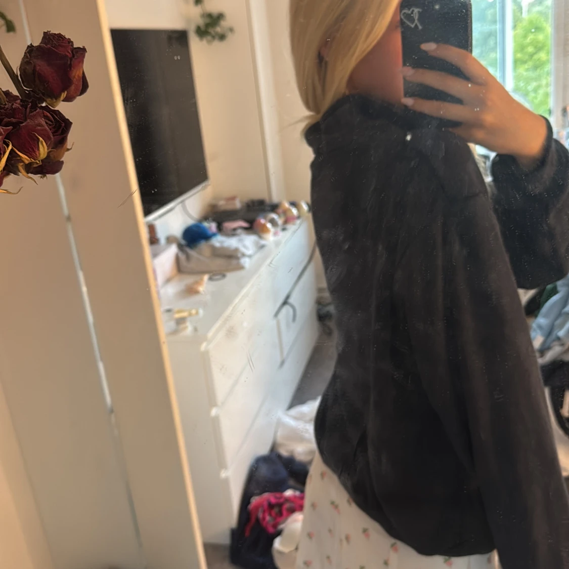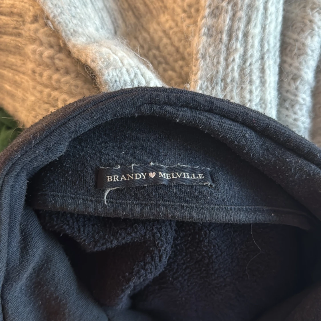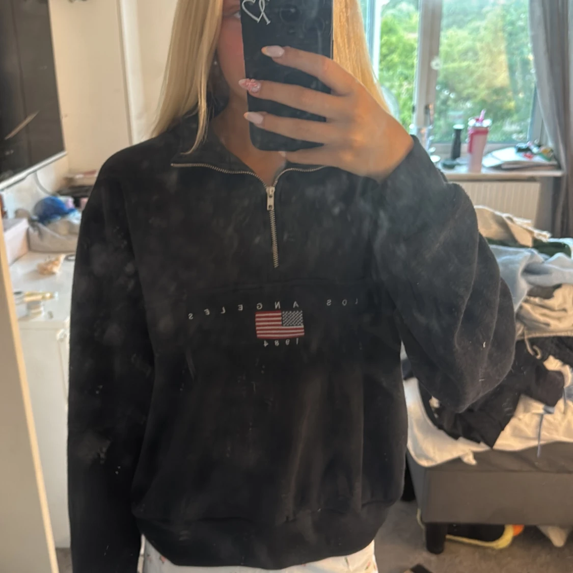 Mörkblå hoodie från Brandy Melville med half zip och broderad amerikansk flagga samt texten 'Los Angeles 1984' på bröstet. Tröjan har hög krage, lång ärm och är i mjukt, fleeceliknande material. Perfekt för en chill och avslappnad stil.