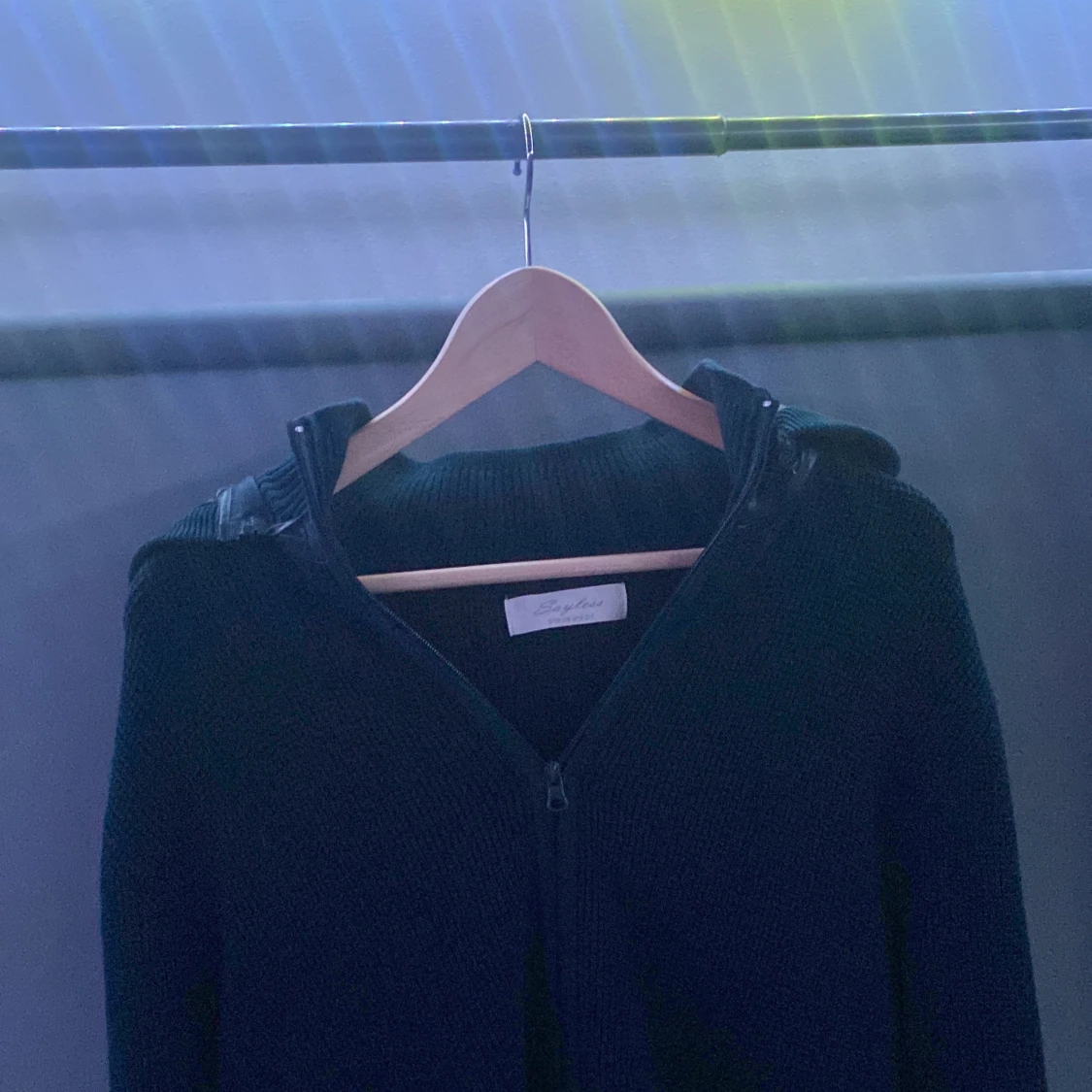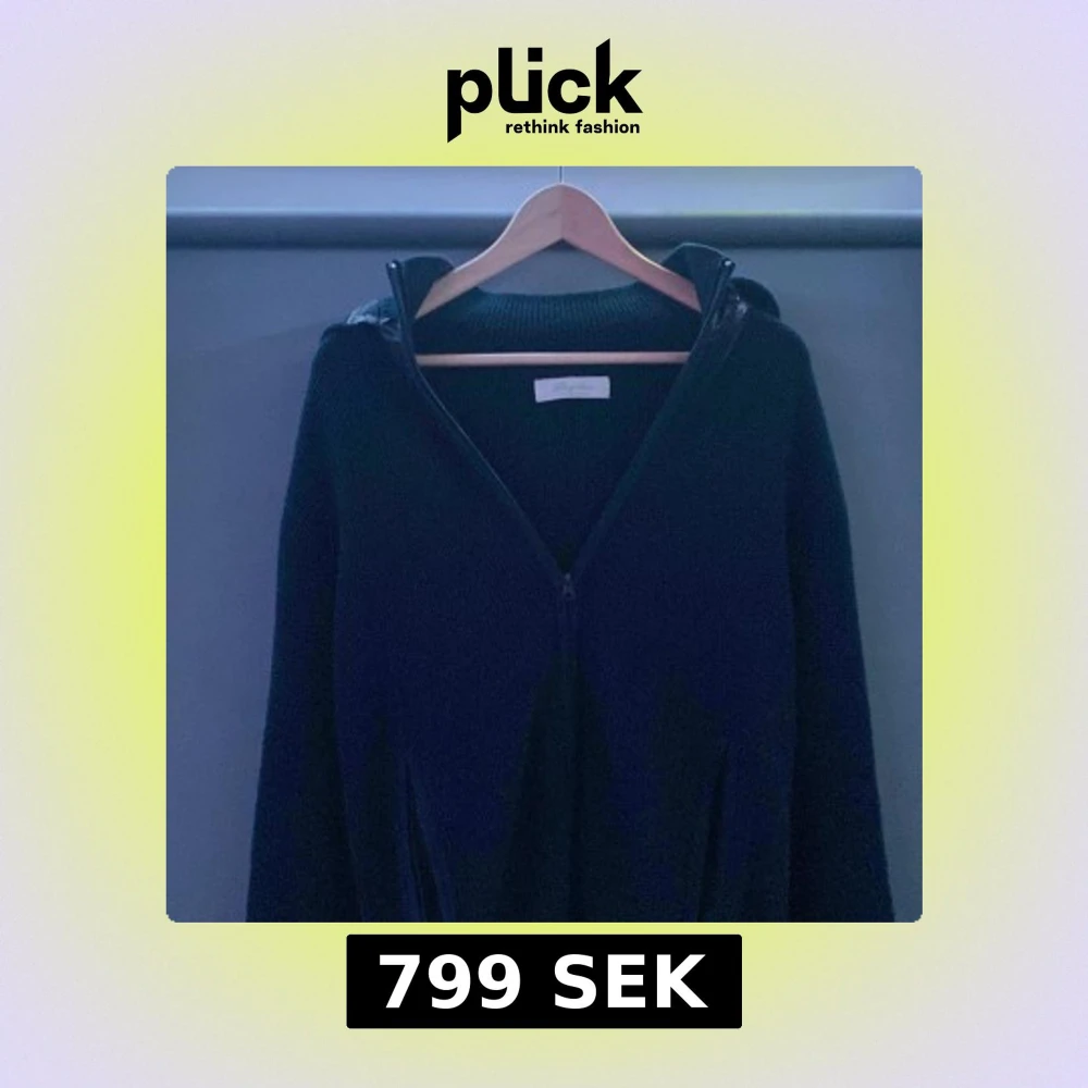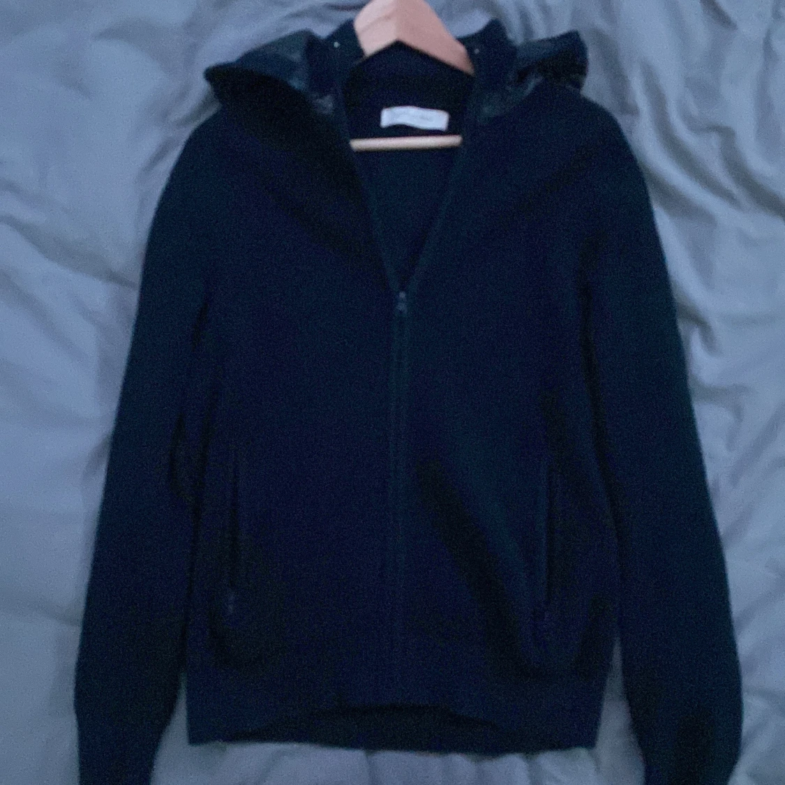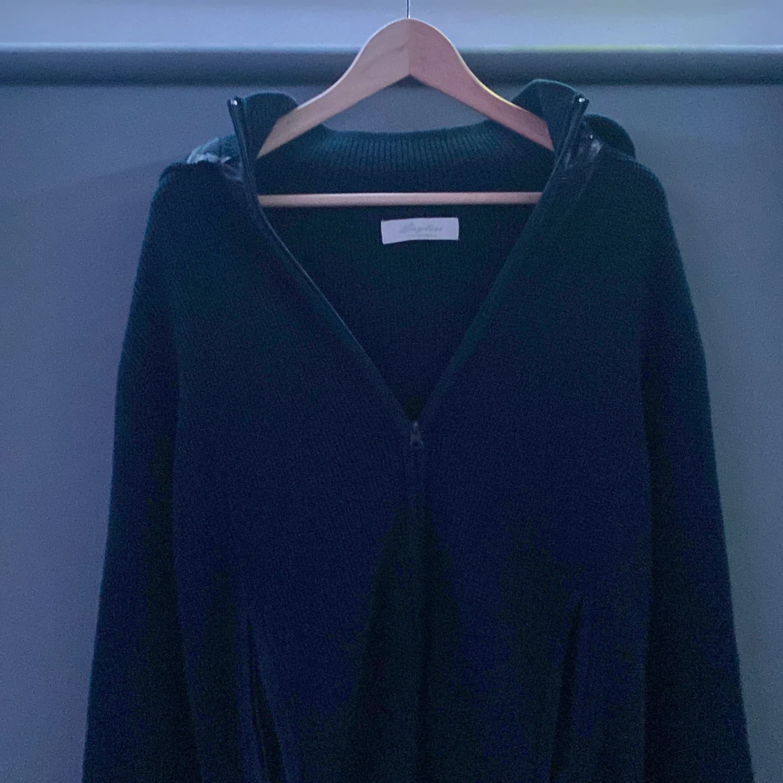 Marinblå cardigan från sayless med dragkedja framtill och huva. Perfekt för kyliga dagar när du vill vara både bekväm och stilren, med luva som går att ta av. Priset går att diskuteras