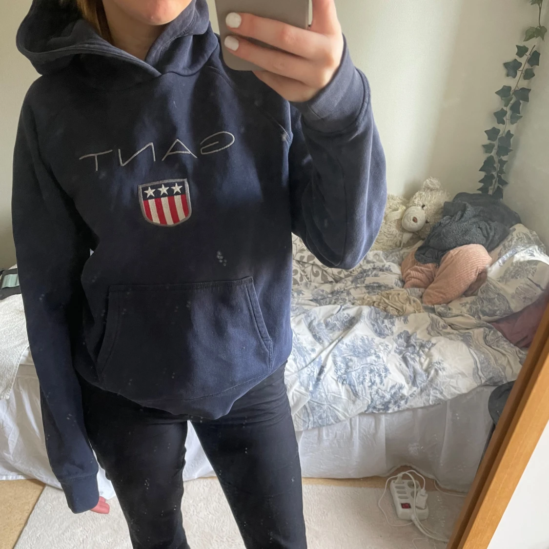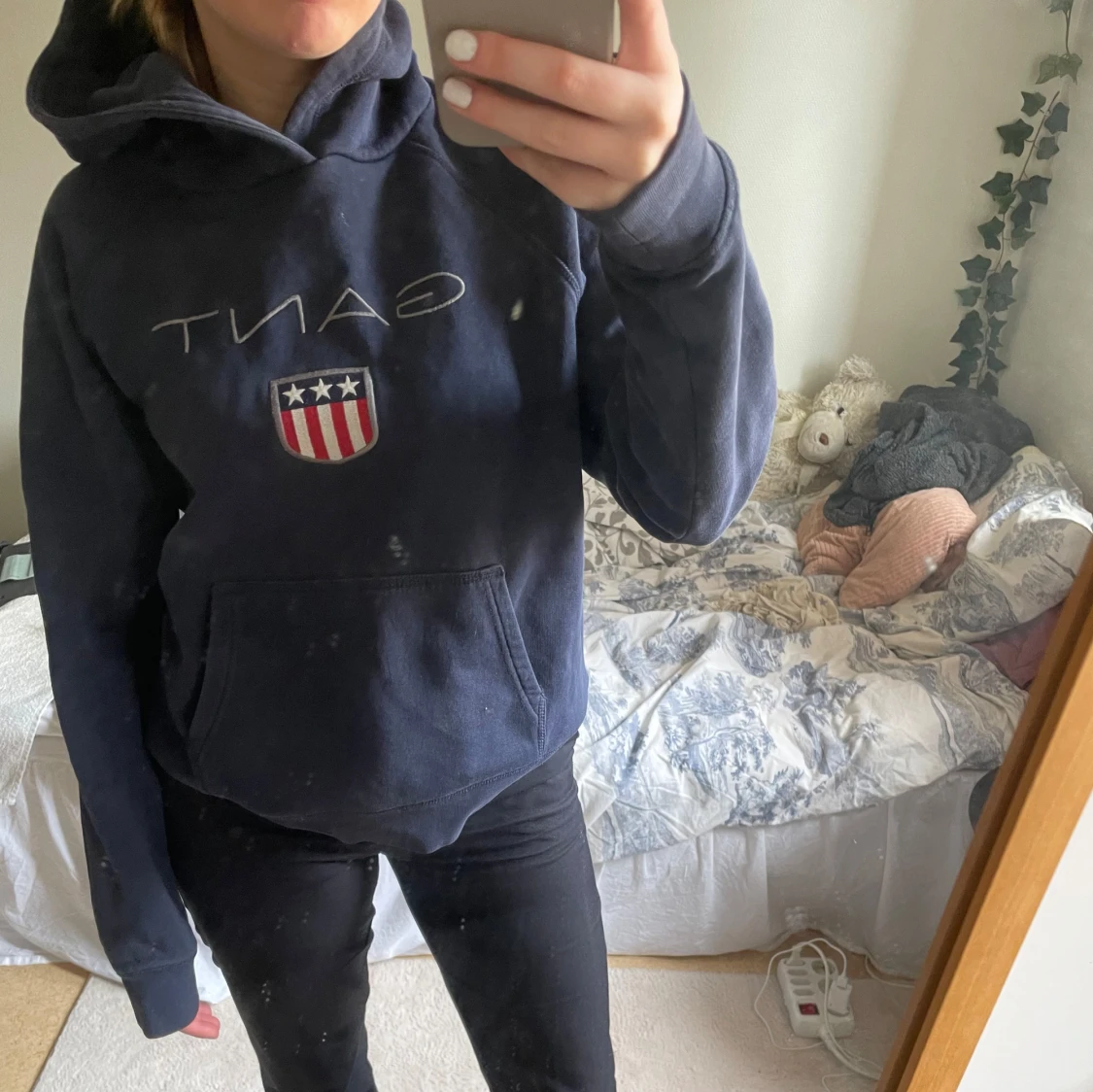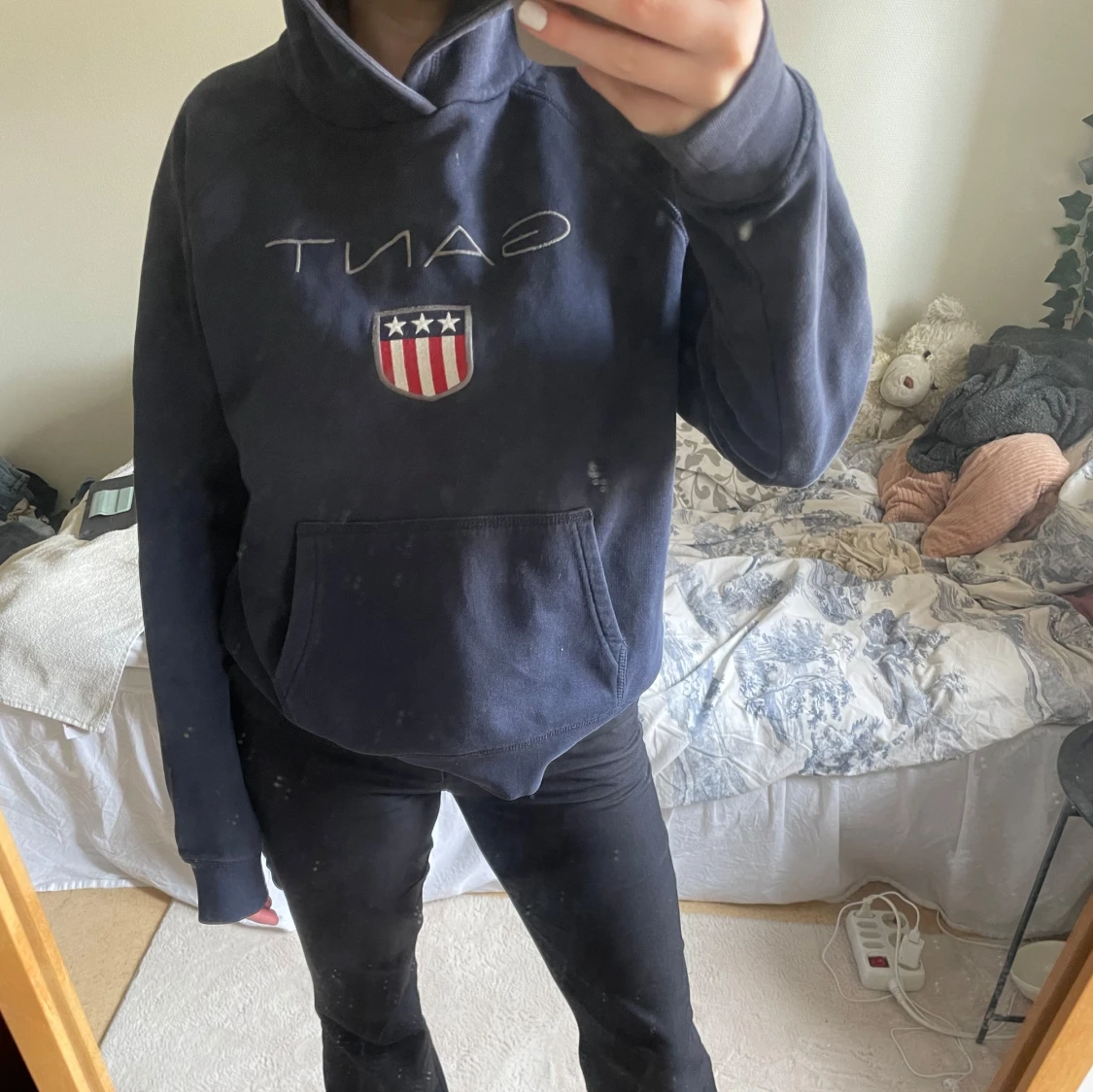 Säljer en snygg mörkblå hoodie från Gant med deras klassiska logga och emblem på bröstet. Tröjan har en stor ficka framtill och en bekväm huva. Perfekt för en avslappnad stil.