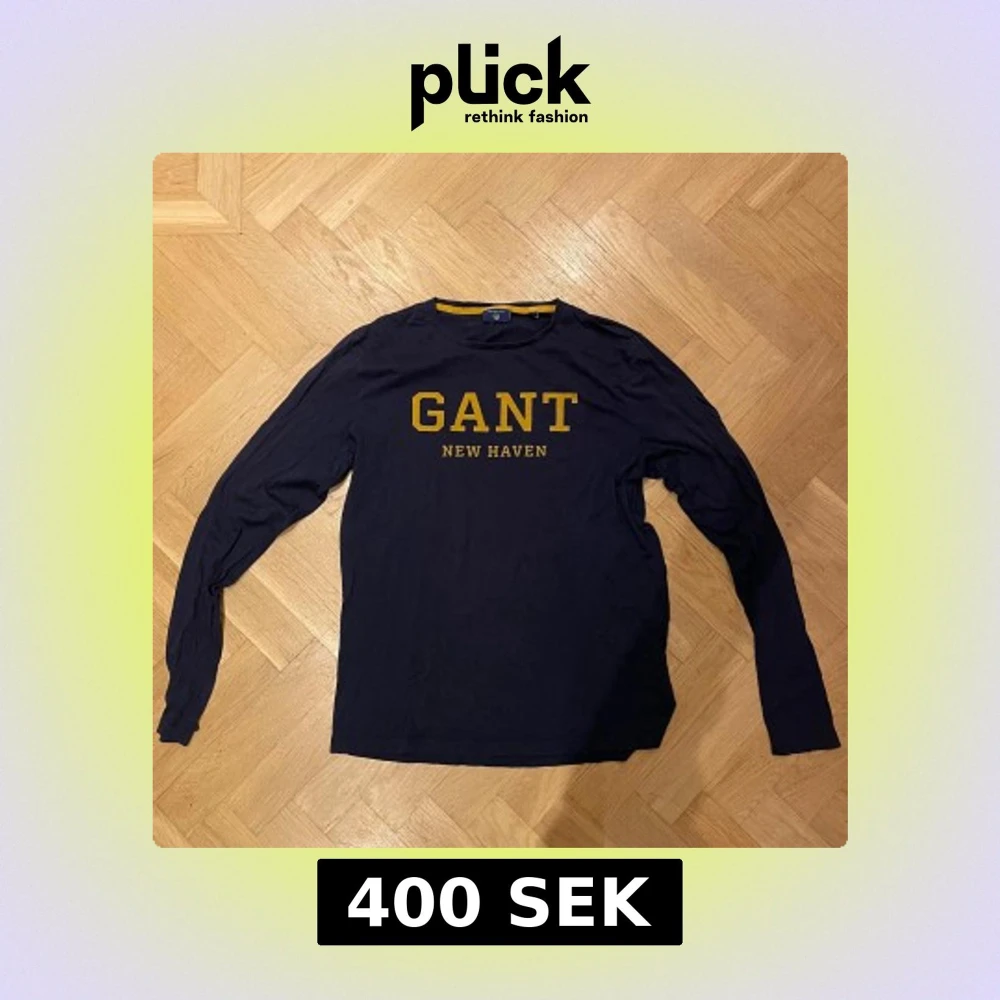 Snygg mörkblå långärmad tröja från GANT med gul text 'GANT NEW HAVEN' på bröstet. Klassisk rund hals och mjukt ”T-shirt” tyg. Perfekt för dig som gillar stilrena och sportiga college-vibbar. I bra skick men använd.