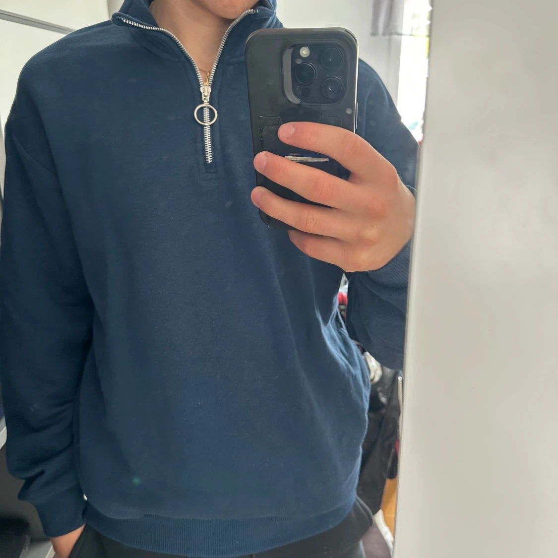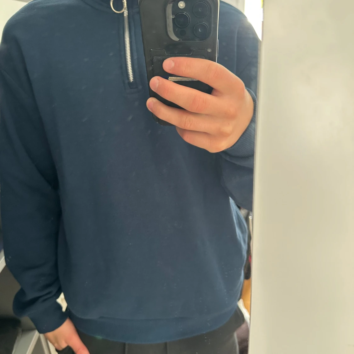 Tröjan har ribbade muddar vid ärmslut och nederkant, samt hög krage. Perfekt för chill dagar och enkel att matcha med jeans eller mjukisbyxor. Jag är 181cm och 75kg