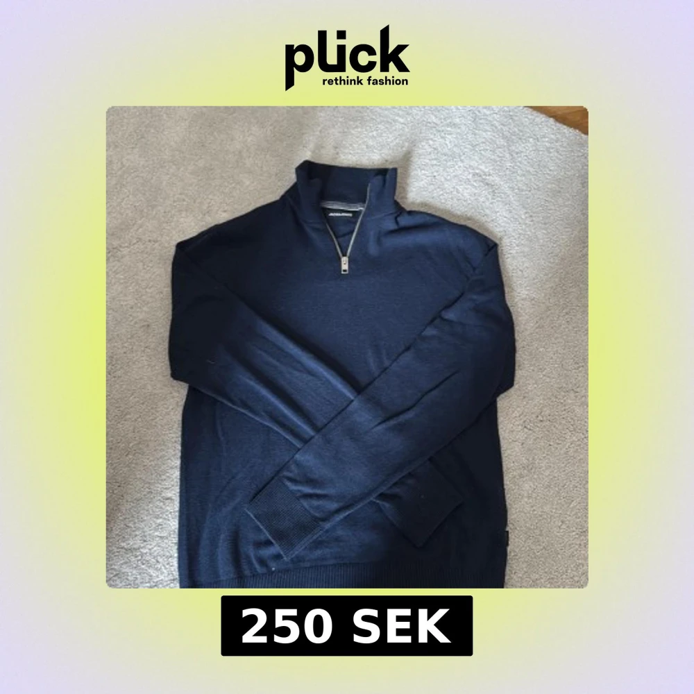 Snygg marinblå långärmad tröja från Jack & Jones med half zip-dragkedja och hög krage. Tröjan är stickad i mjukt material och har ribbade muddar vid ärmslut och nederkant. Storlek xs men sitter mer som S