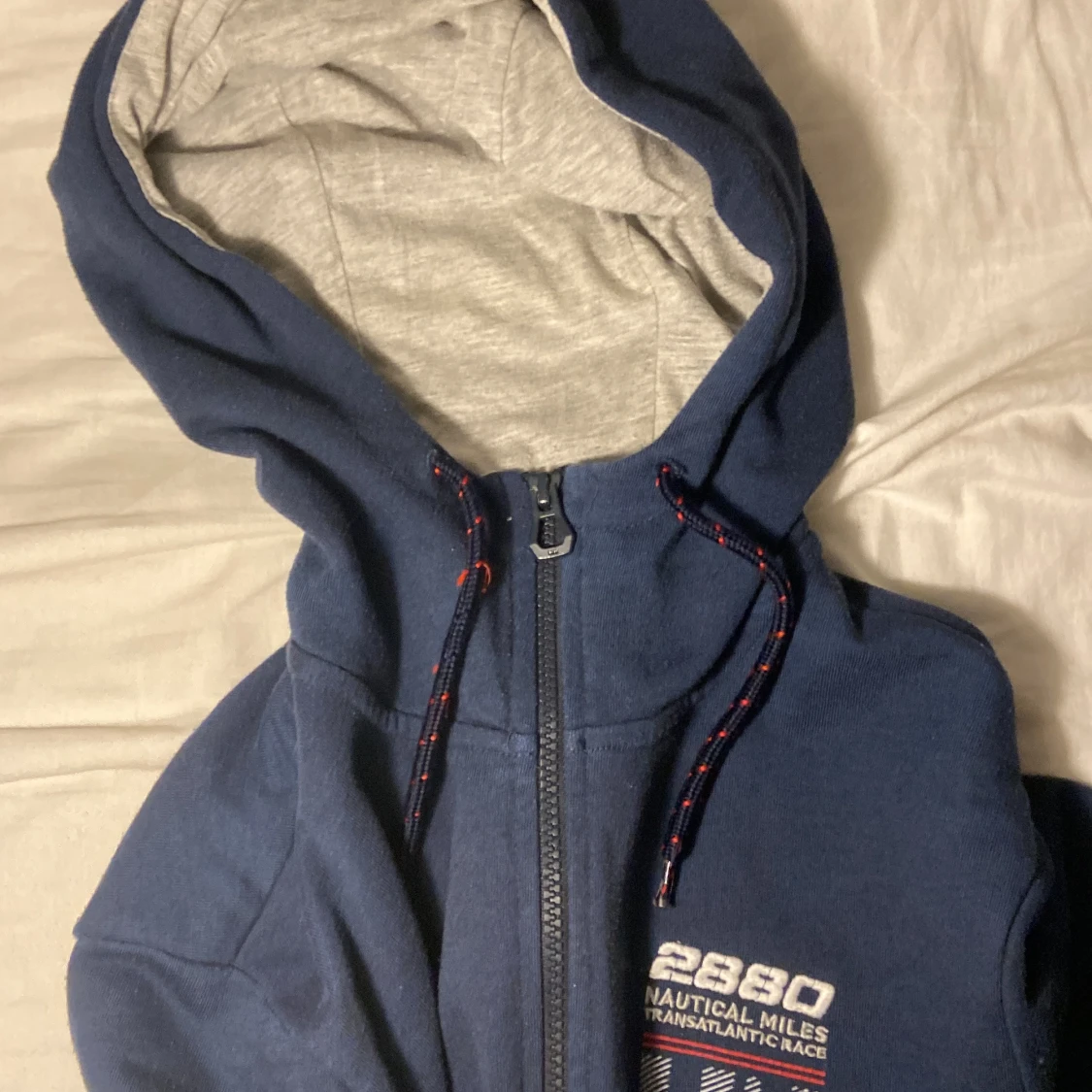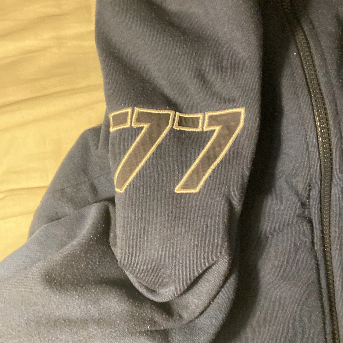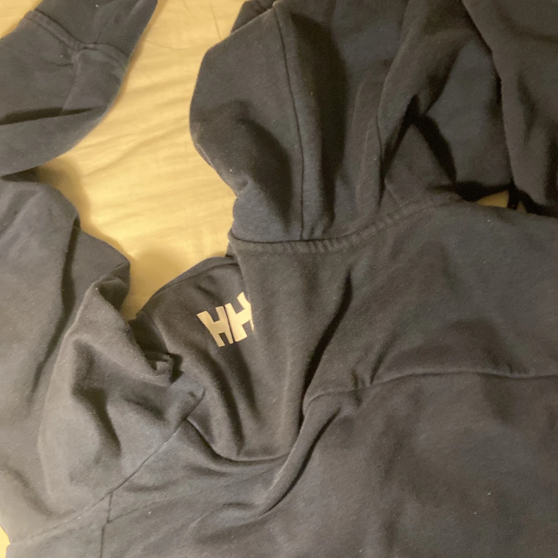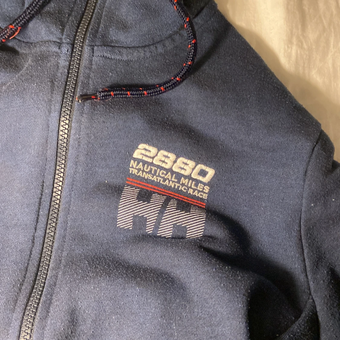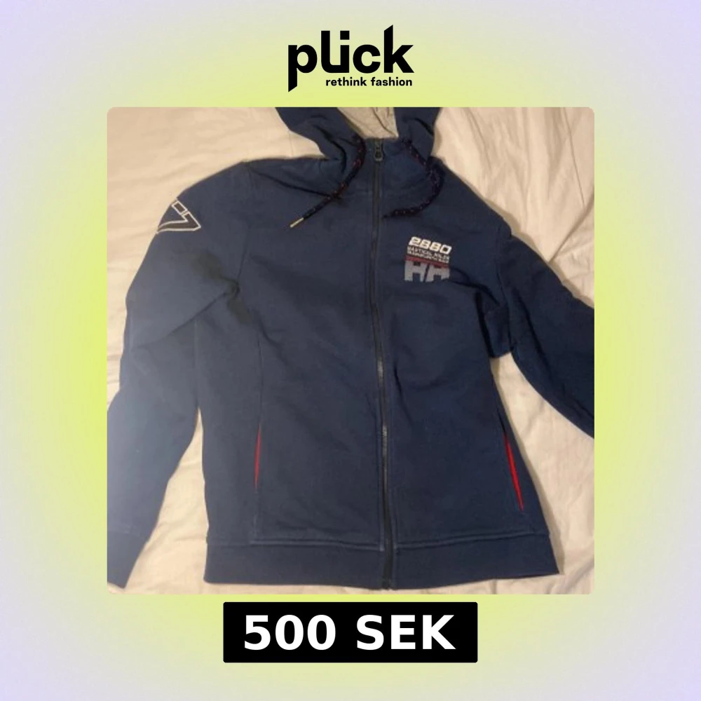 Marinblå hoodie från Helly Hansen med hel dragkedja, broderad text och HH-logga på bröstet samt siffran 77 på ärmen. Tröjan har huva med snörning, röda detaljer vid fickorna och är fodrad i grått tyg på insidan av huvan. Perfekt för chill dagar.