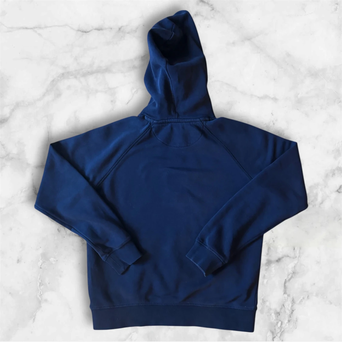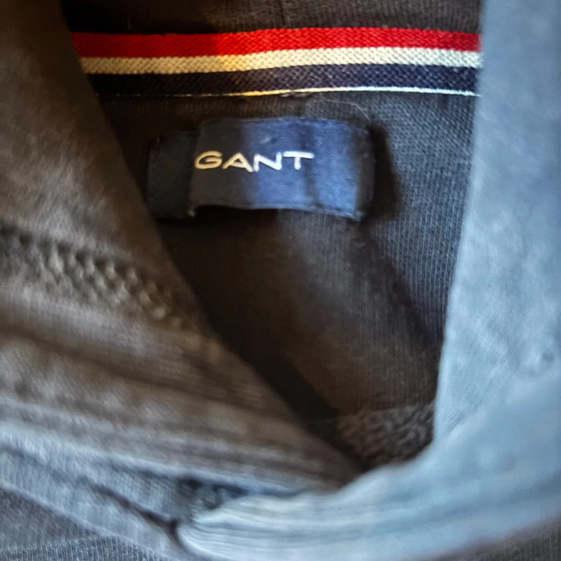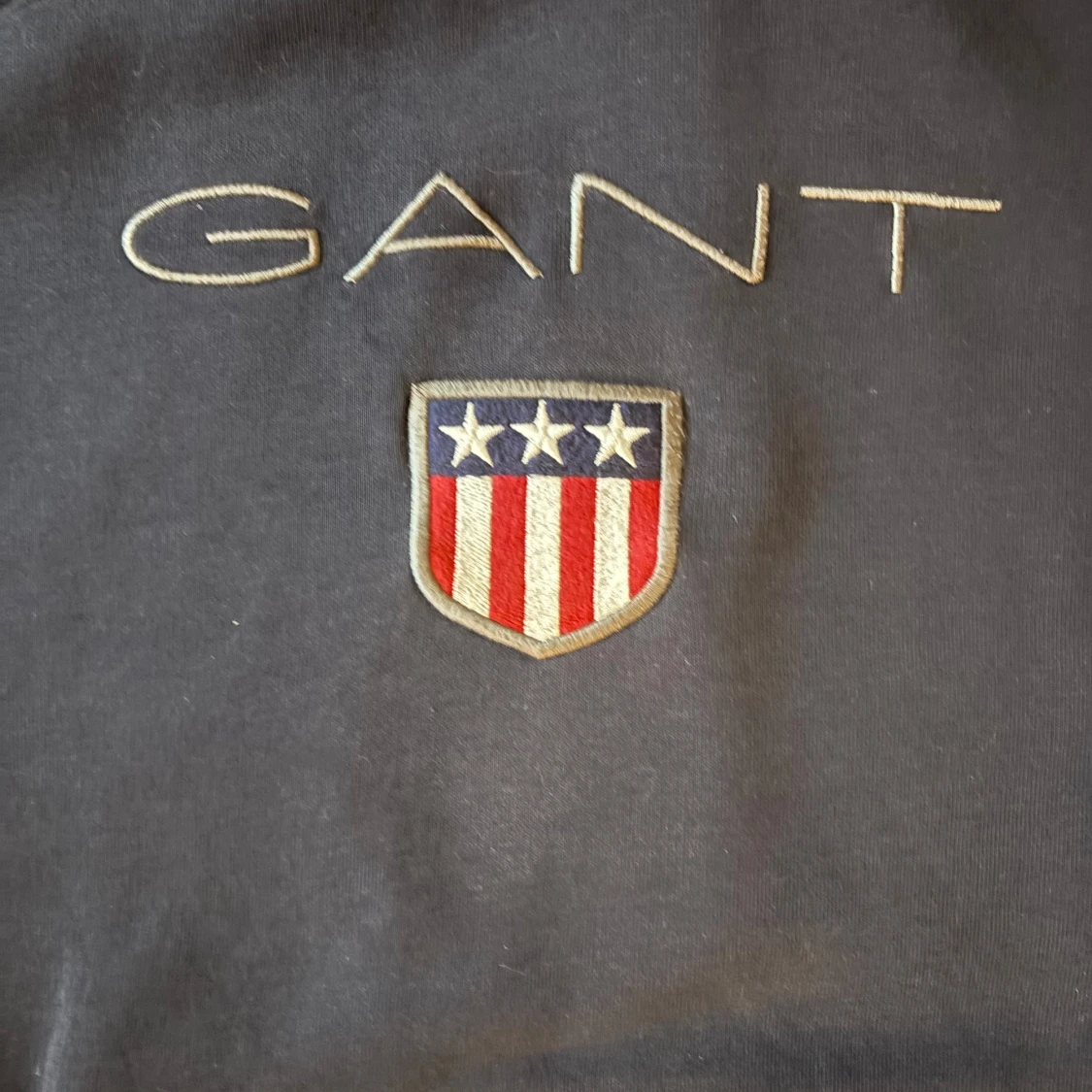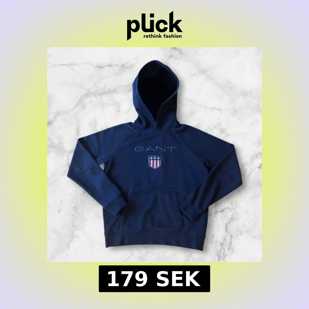 Säljer en marinblå hoodie från GANT med broderad logga och sköld på bröstet. Tröjan har huva, magficka och långa ärmar. Perfekt för en avslappnad stil och enkel att matcha med jeans eller joggers.