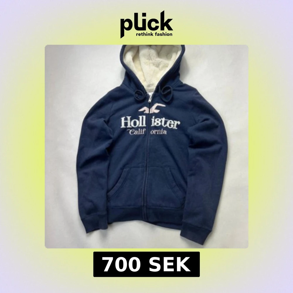Säljer en marinblå hoodie från Hollister med vit fluffig huva och broderad logga på bröstet. Tröjan har dragkedja, snörning vid huvan och två fickor framtill. Perfekt för dig som gillar en chill och snygg stil.