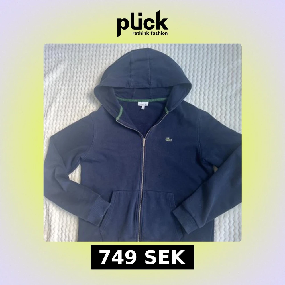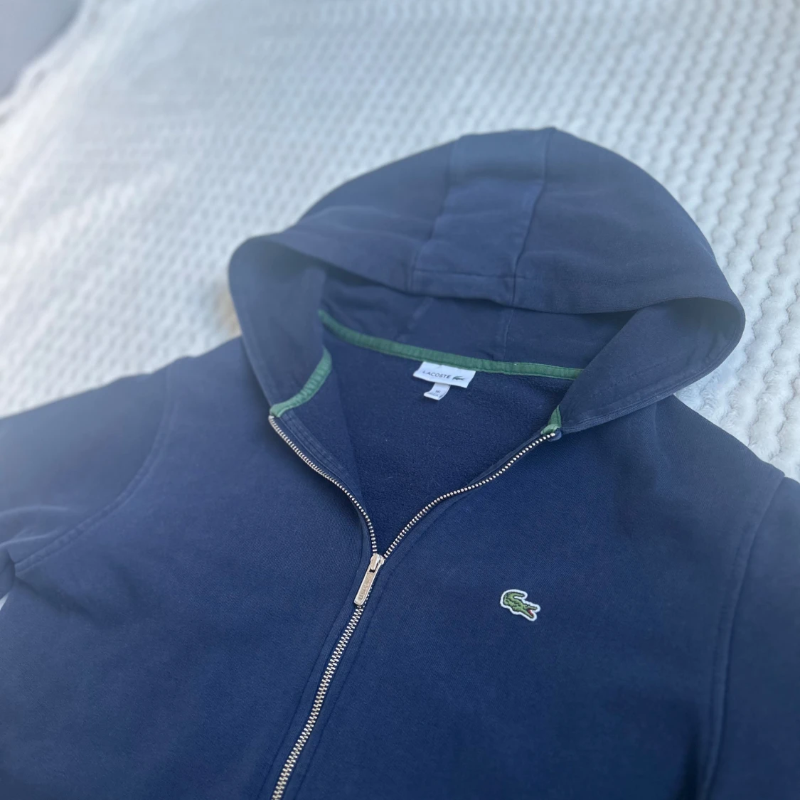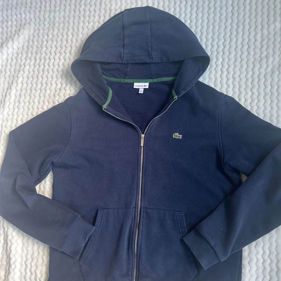 Snygg marinblå hoodie från Lacoste med dragkedja och klassisk krokodillogga på bröstet. Tröjan har huva, ribbade muddar och gröna detaljer vid kragen. Tillverkad i mjuk bomulls- och polyestermix för skön känsla. Har ni frågor eller tankar så är det bara att skriva, priset kan diskuteras!