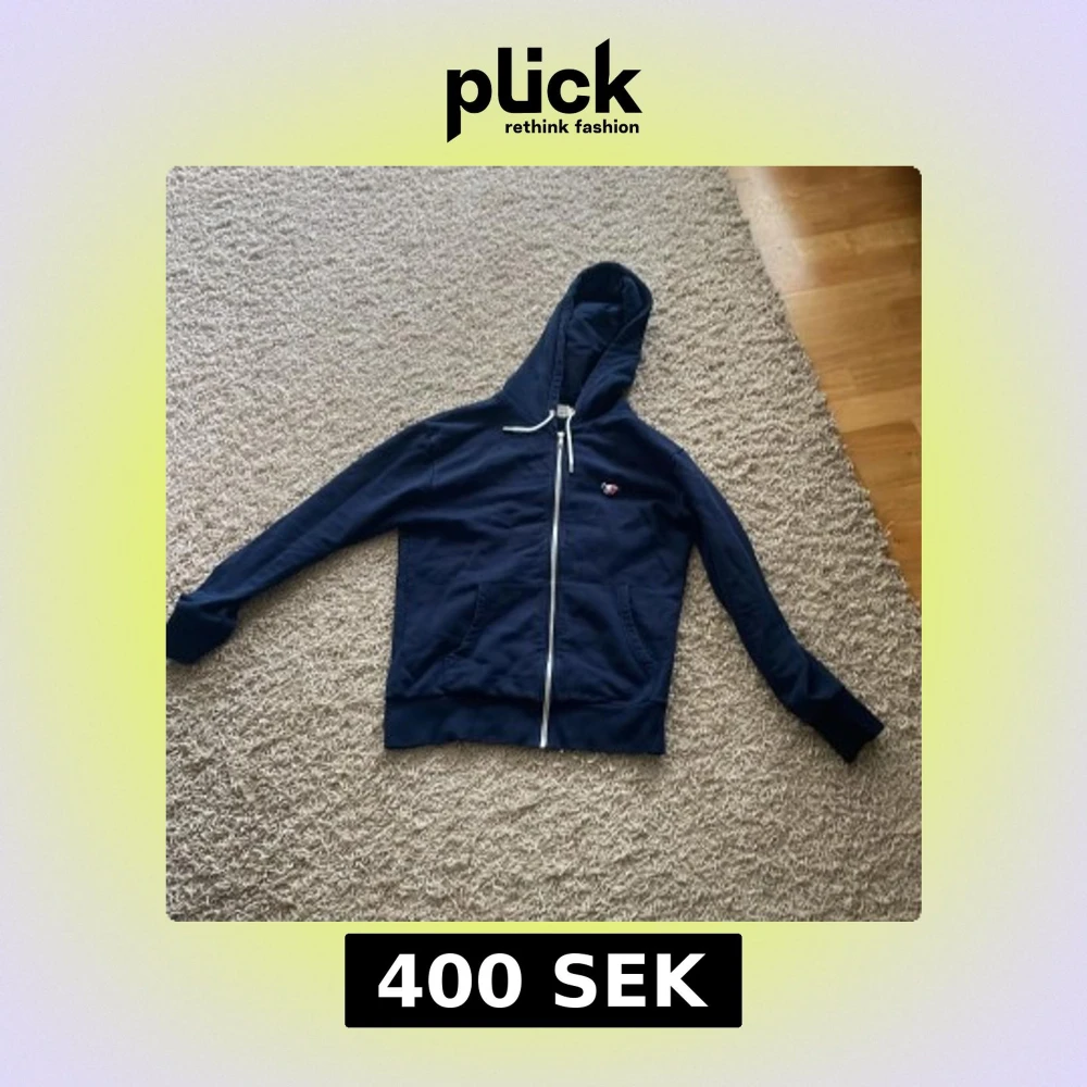 Snygg marinblå hoodie från Maison Kitsuné med dragkedja och huva. Tröjan har vita snören, två fickor fram och en broderad rävlogga i blått, vitt och rött på bröstet. Perfekt för dig som gillar stilrena och bekväma plagg.