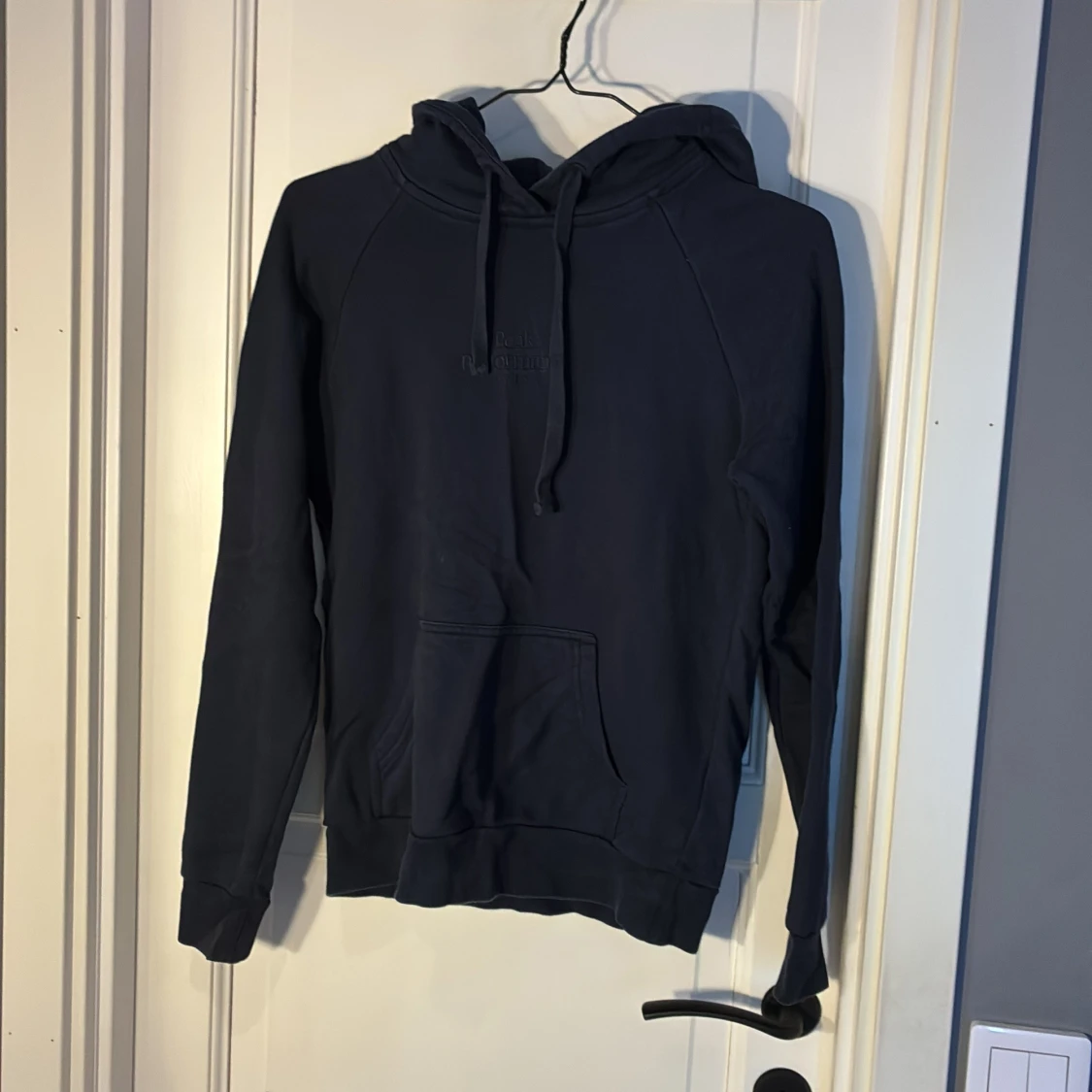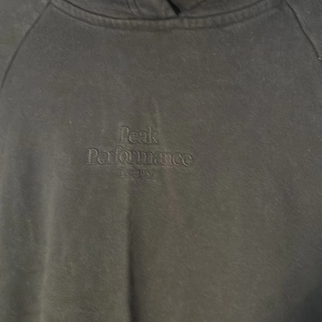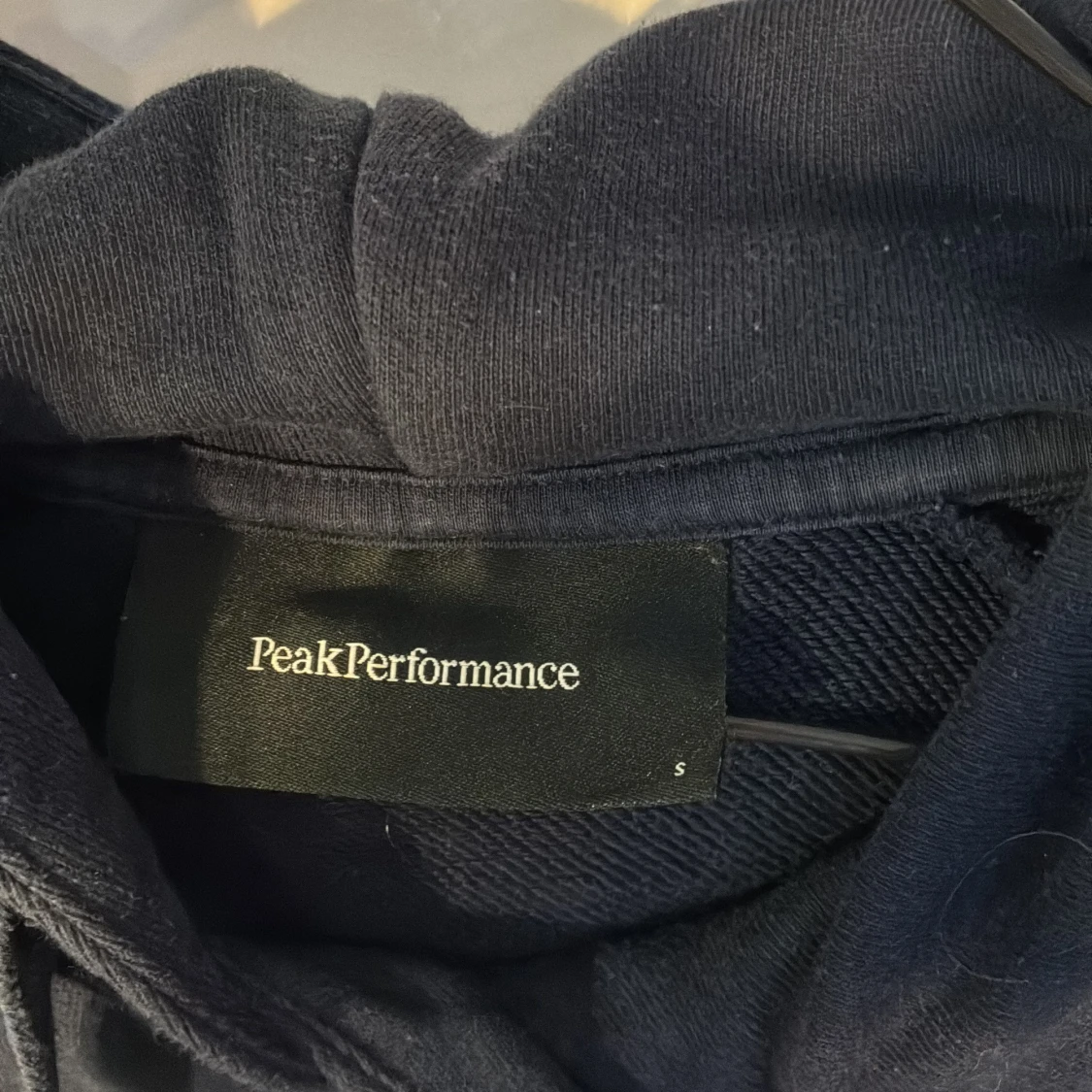 Marinblå hoodie från Peak Performance med broderad logga på bröstet. Klassisk modell med huva, snörning och känguruficka framtill. Perfekt för chill dagar eller när du vill ha en clean look. Sista bilden är mer rättvis i färg!