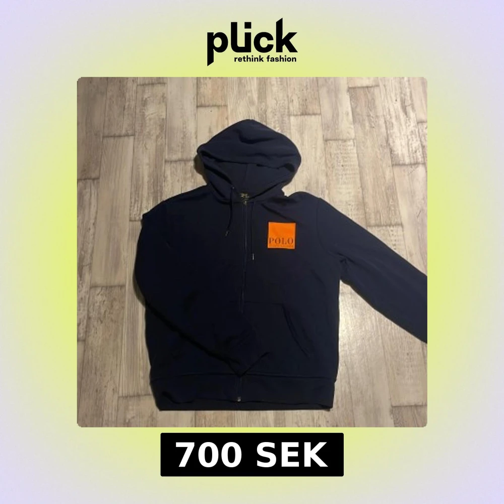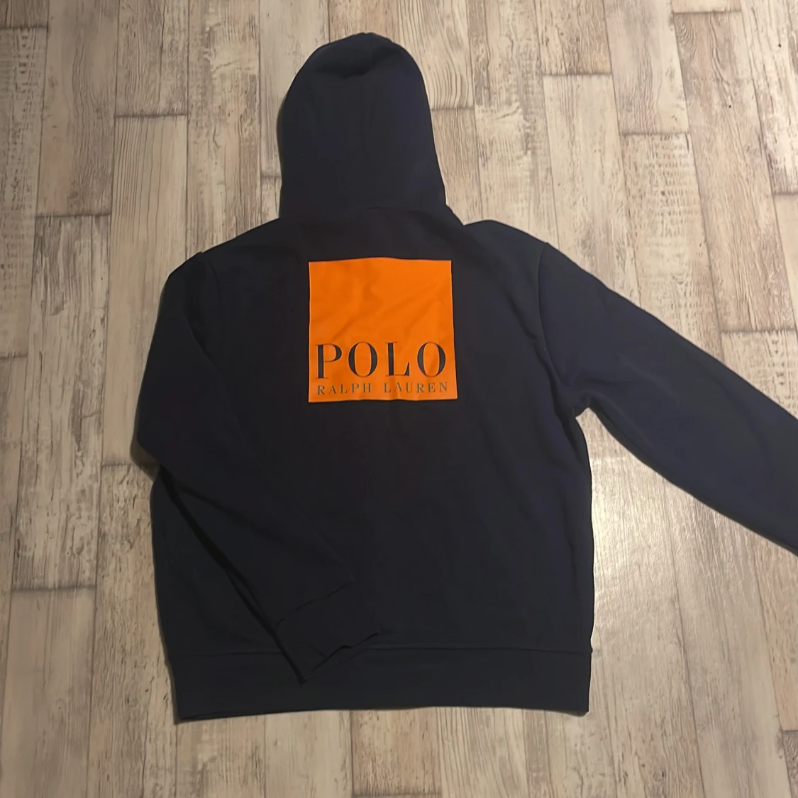 Snygg marinblå hoodie från Polo Ralph Lauren i nyskick med stor orange logga på både bröstet och ryggen. Tröjan har huva, dragkedja framtill och en klassisk känguruficka. Perfekt för dig som gillar streetwear och vill sticka ut med en fet logga.