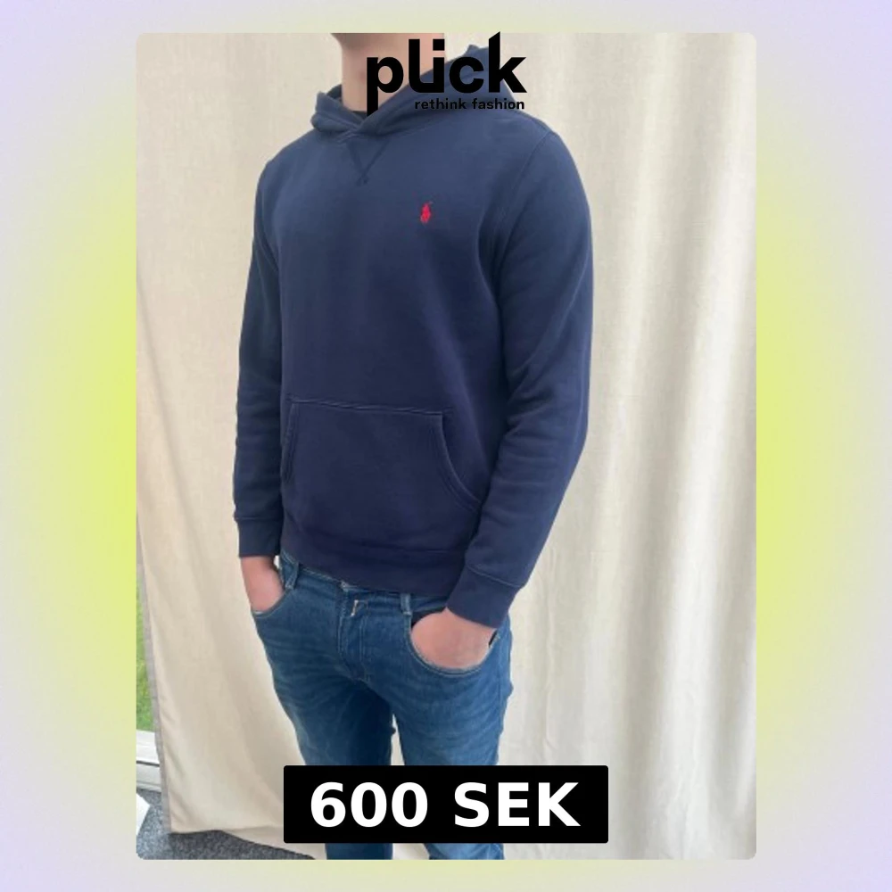 Snygg marinblå hoodie från Polo Ralph Lauren i storlek som sitter som storlek S-M beror på hur du själv vill att den ska sitta. Jag själv är 184 cm