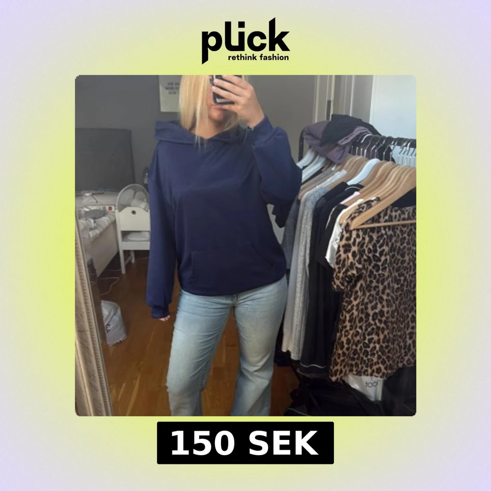 Säljer en marinblå hoodie med tryck på baksidan med palmer och inspirerande texter. Tröjan har huva, magficka och ribbade muddar vid ärmslut och nederkant.
