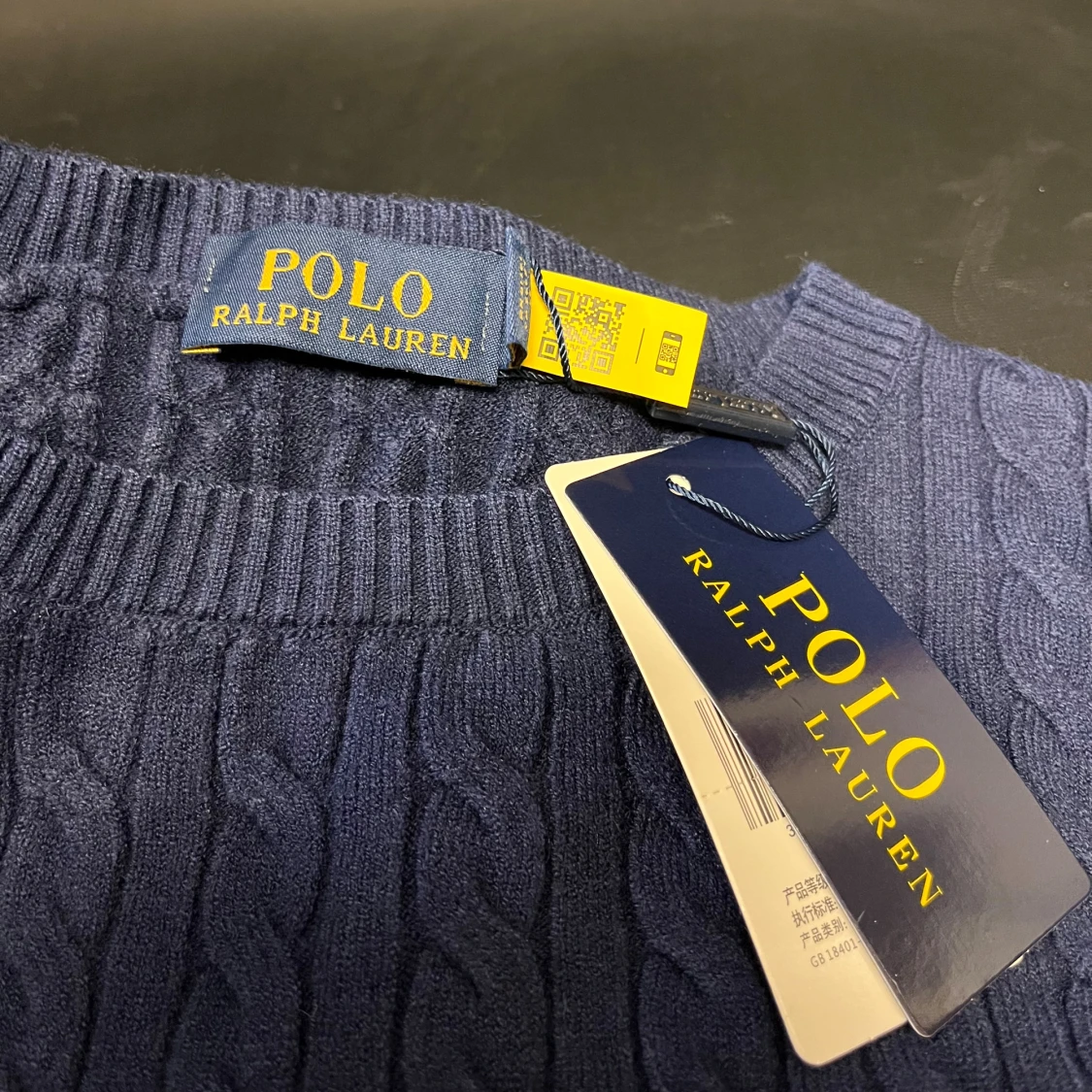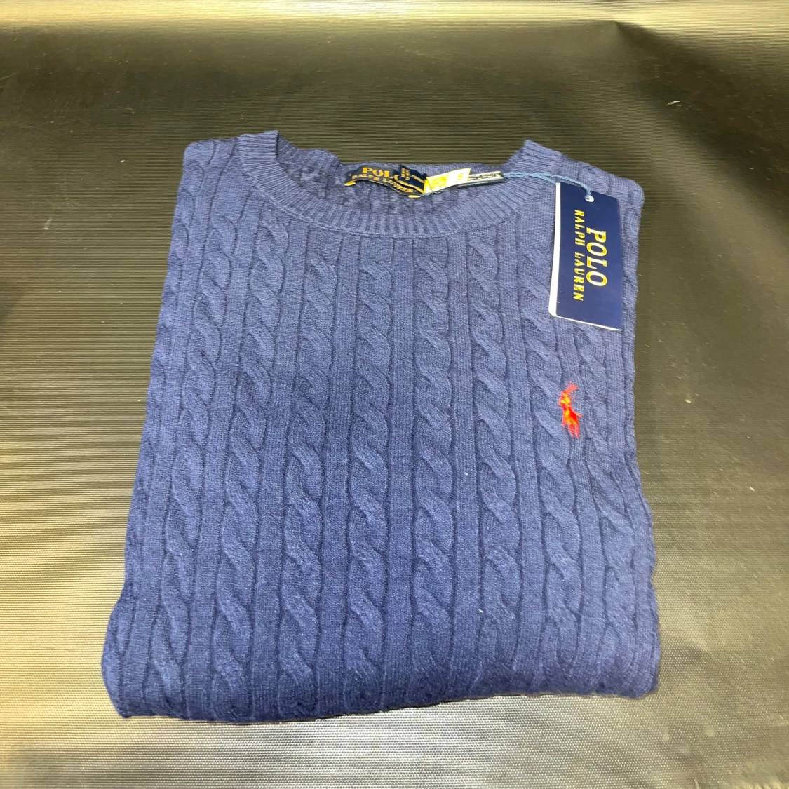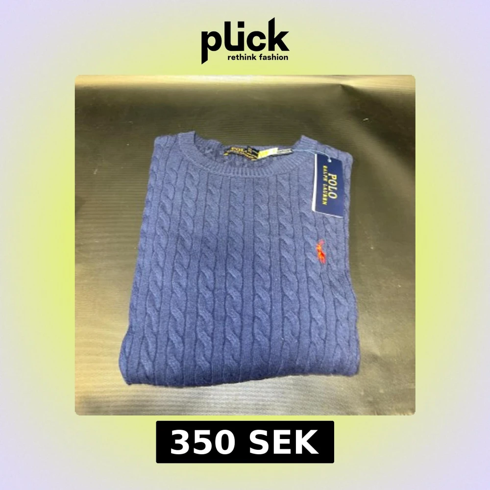 Kabelstickad marinblå tröja med rund halsringning och klassisk röd broderad logga på bröstet. Tröjan är i bomull och har en tidlös, stilren look som passar perfekt till jeans eller chinos.