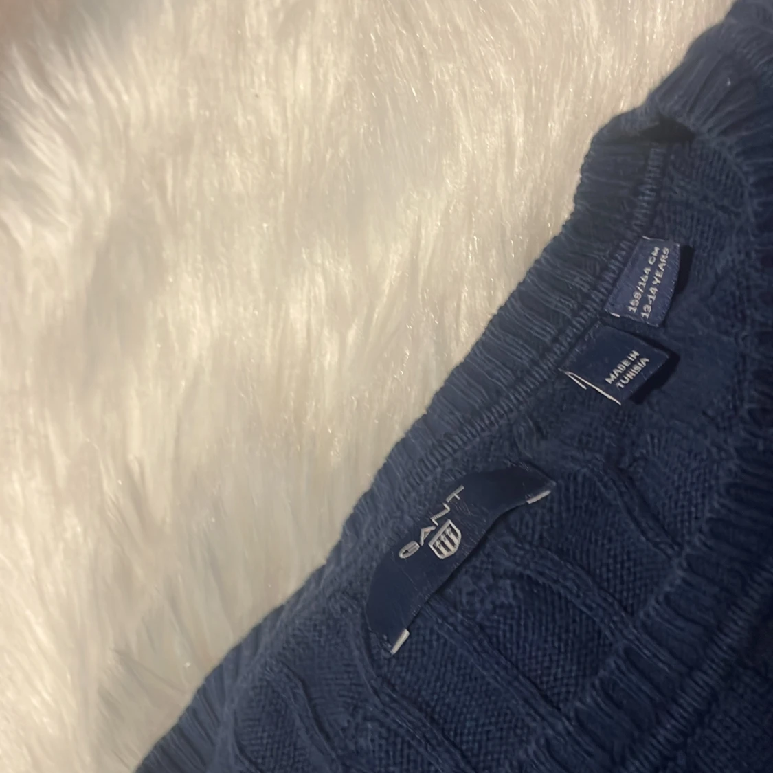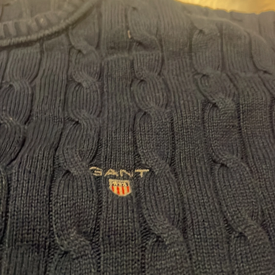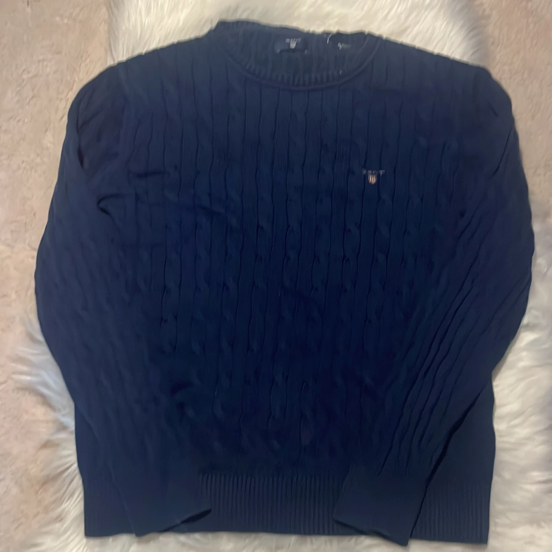 Kabelstickad marinblå tröja från Gant med broderad logga på bröstet. Klassisk rund halsringning och ribbade muddar. Perfekt för dig som gillar preppy stil och vill ha något snyggt och tidlöst i garderoben.