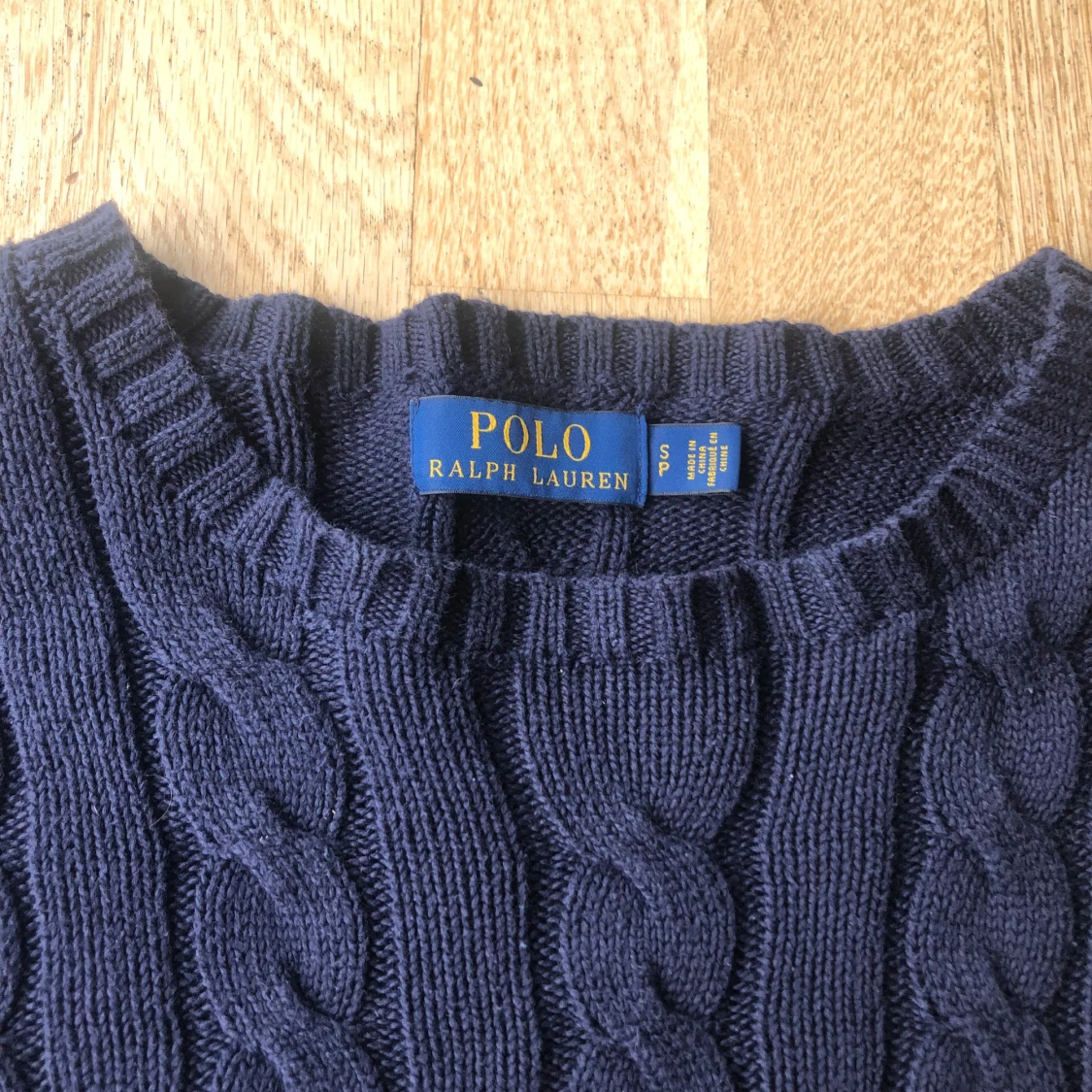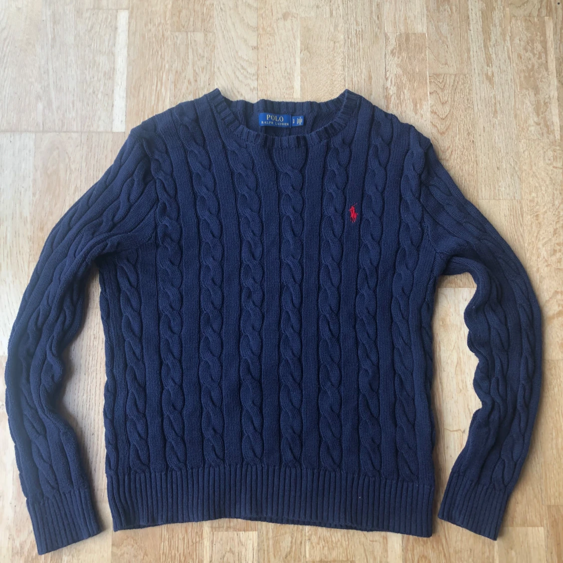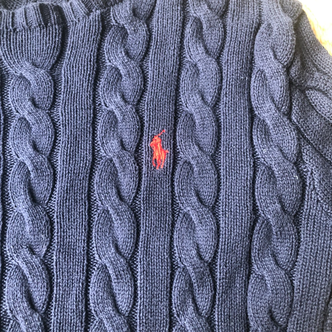 Kabelstickad marinblå tröja från Polo Ralph Lauren med klassisk rund hals och röd broderad logga på bröstet. Tröjan har långa ärmar och ribbade muddar vid ärmslut och nederkant. Har du någon fråga eller liknande är det bara att ställa. Pris kan diskuteras och byten kan vara intressant