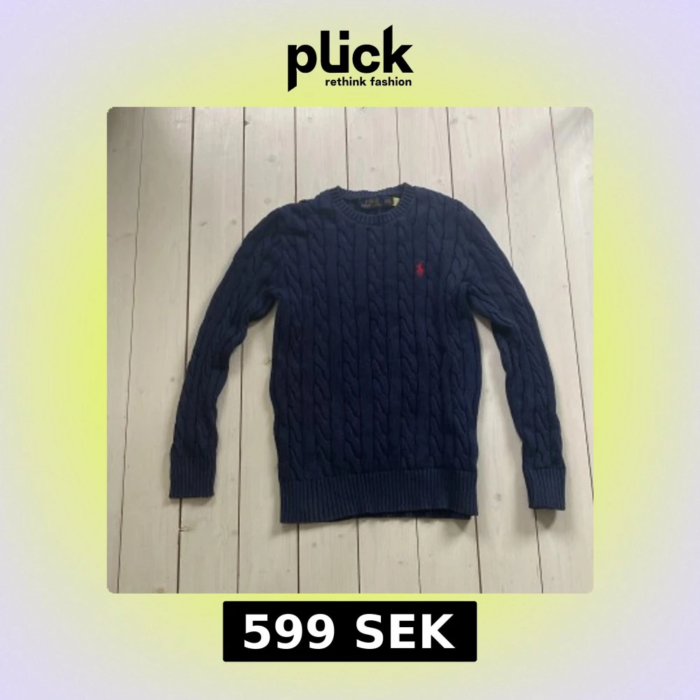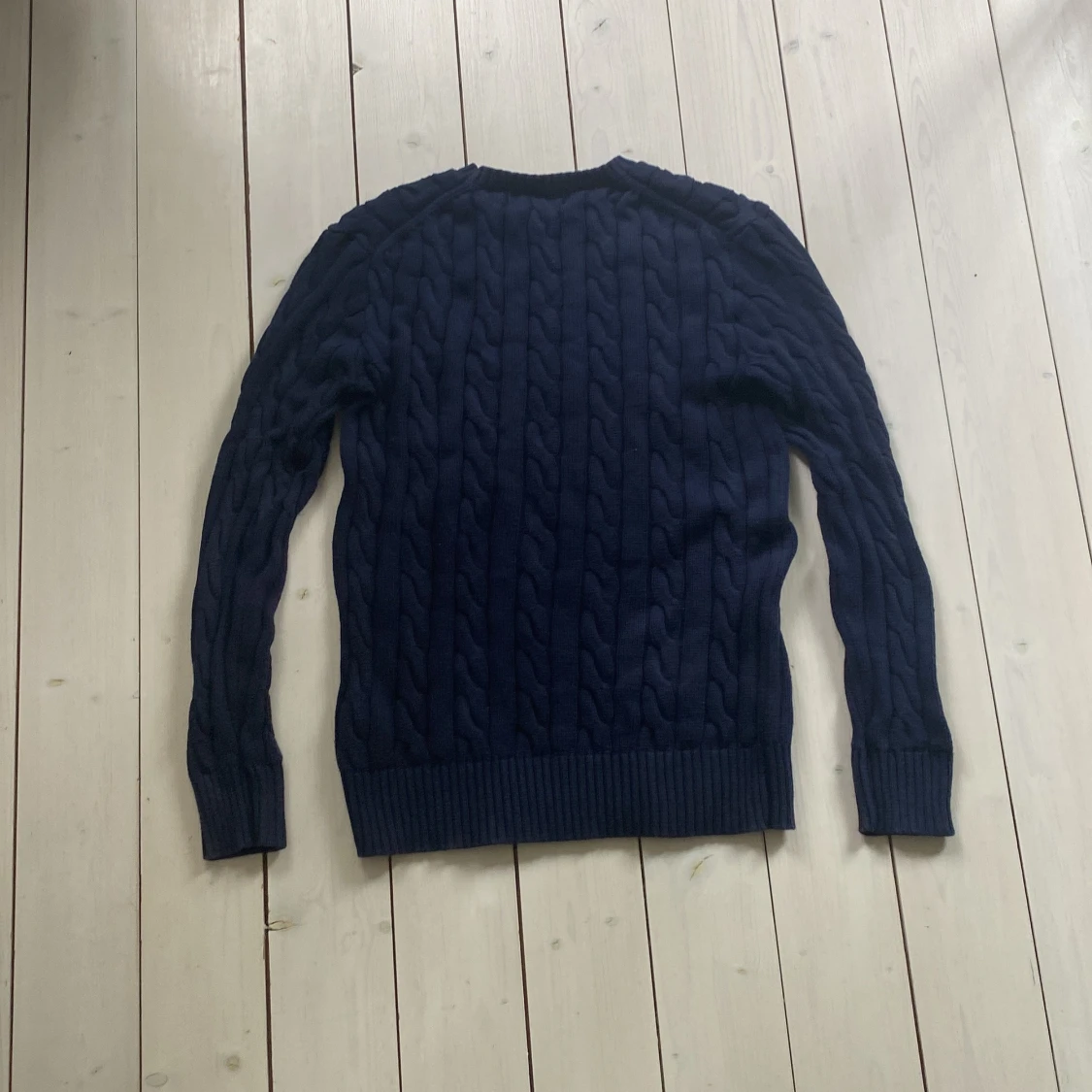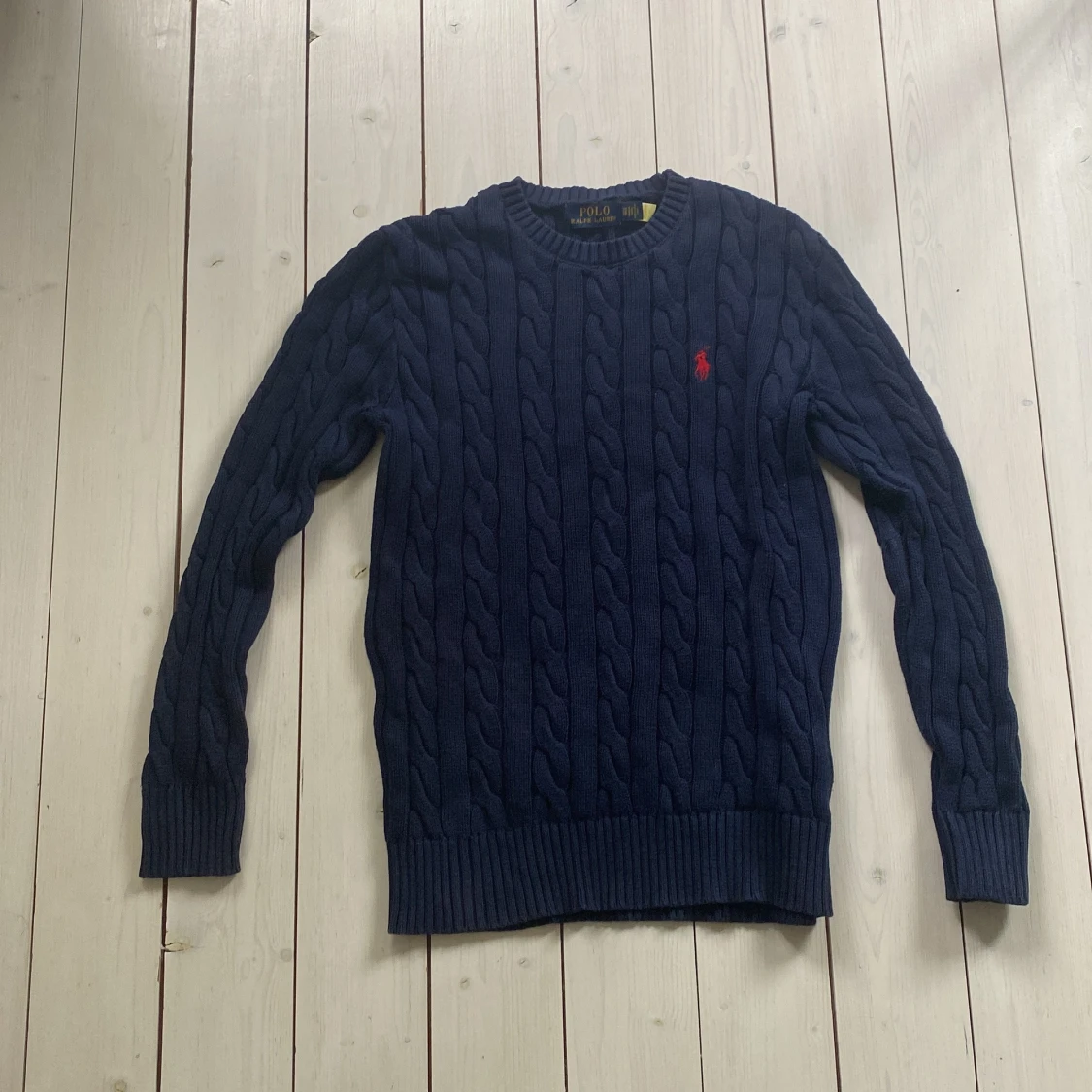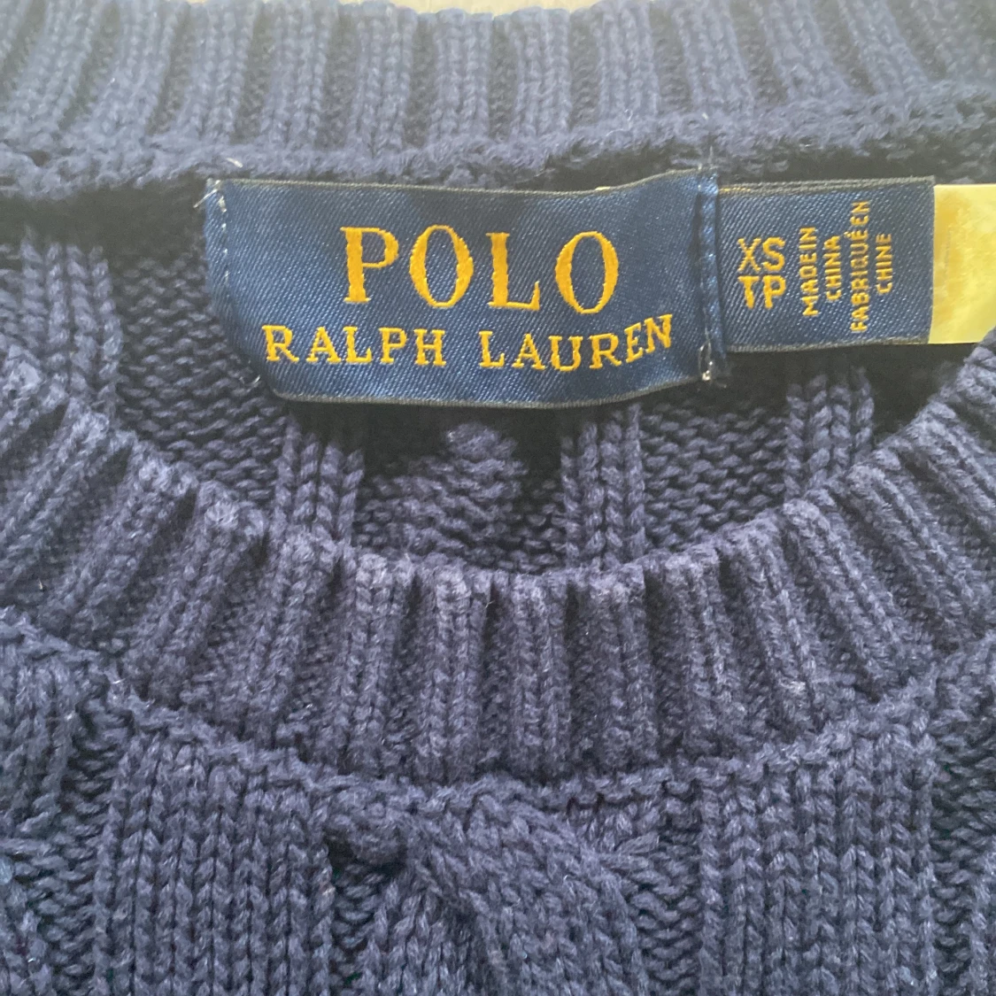 Snygg marinblå kabelstickad tröja från Polo Ralph Lauren i storlek XS. Tröjan har ett klassiskt rött broderat logomärke på bröstet, rund hals och ribbade muddar. Perfekt för dig som gillar stilrena och tidlösa plagg med premiumkänsla.