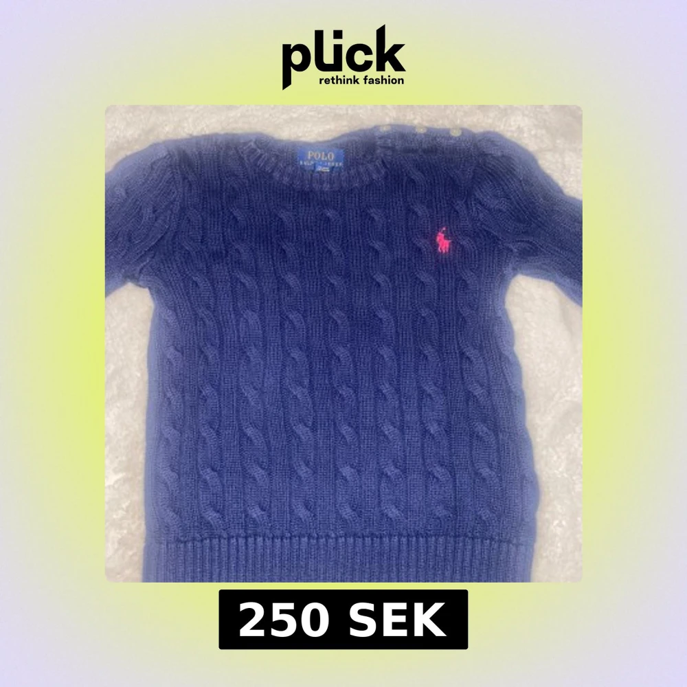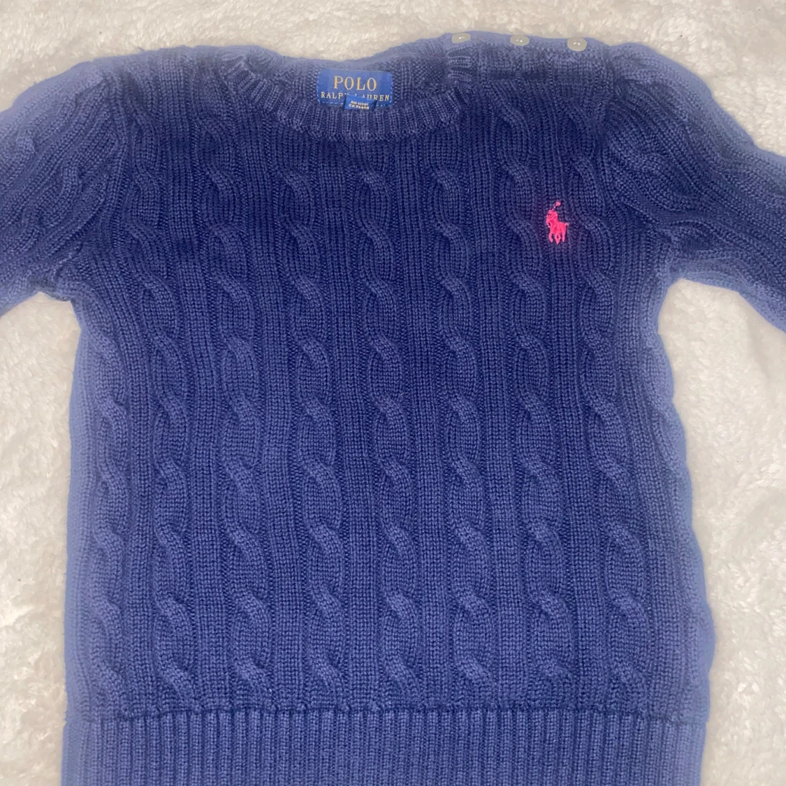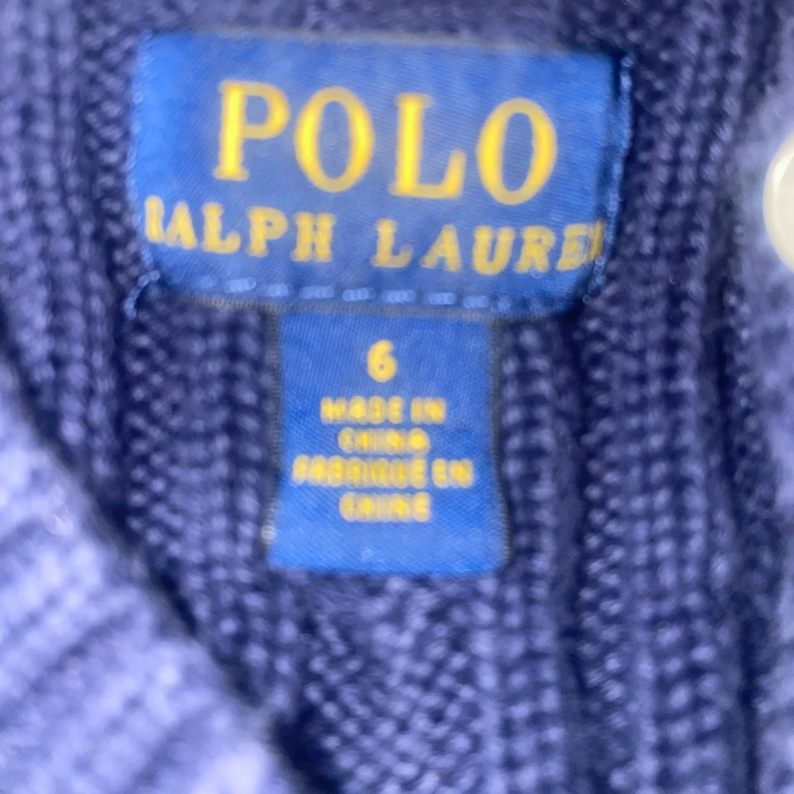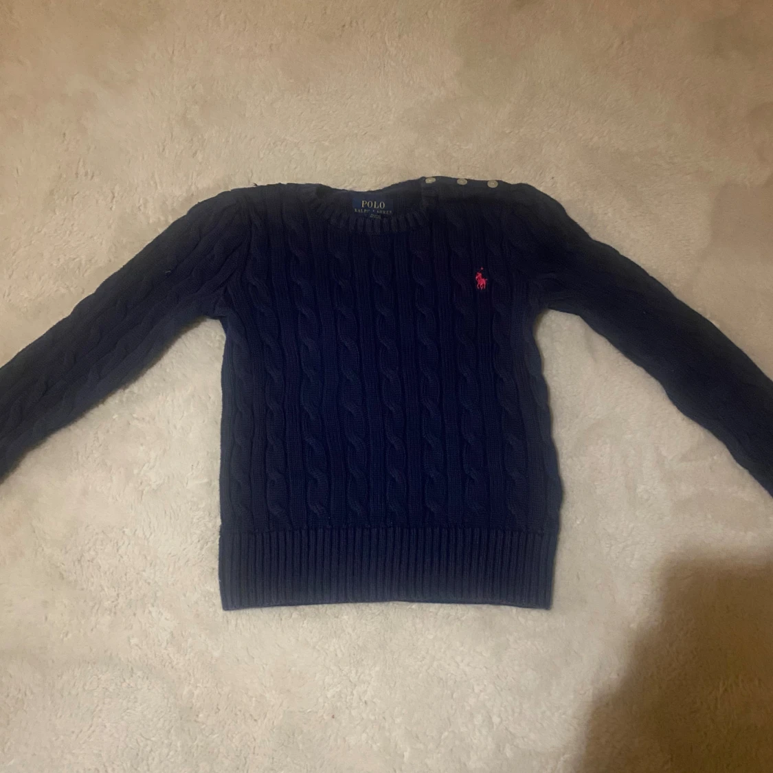 Kabelstickad marinblå tröja från Polo Ralph Lauren med rund halsringning, långa ärmar och knappar på axeln. Tröjan har en röd broderad logga på bröstet och är gjord i mjuk bomull. Perfekt för dig som gillar klassisk preppy stil. Barn storlek