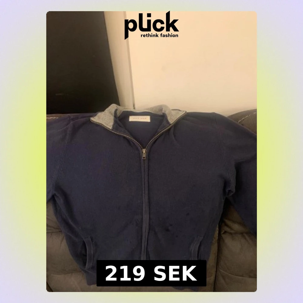 Kofta i marinblått från Pier One med hel dragkedja framtill och ribbad grå insida på kragen. Tröjan har två fickor och är långärmad, perfekt för lager-på-lager. Materialet känns mjukt och är troligtvis bomull eller bomullsblandning.