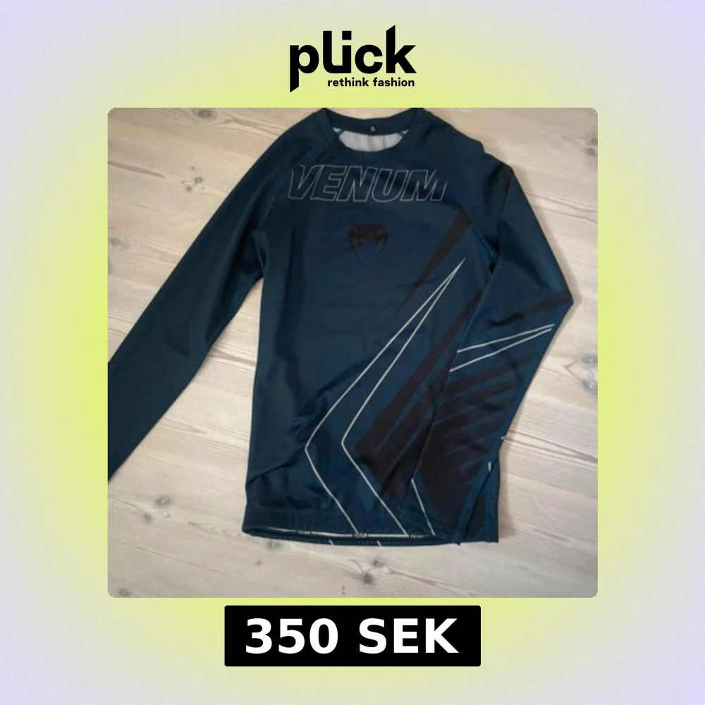 Säljer en svart långärmad träningströja från Venum med tryckt logga och grafiska linjer i grått och svart. Tröjan är i syntetmaterial och har en tight passform, perfekt för gym eller kampsport.