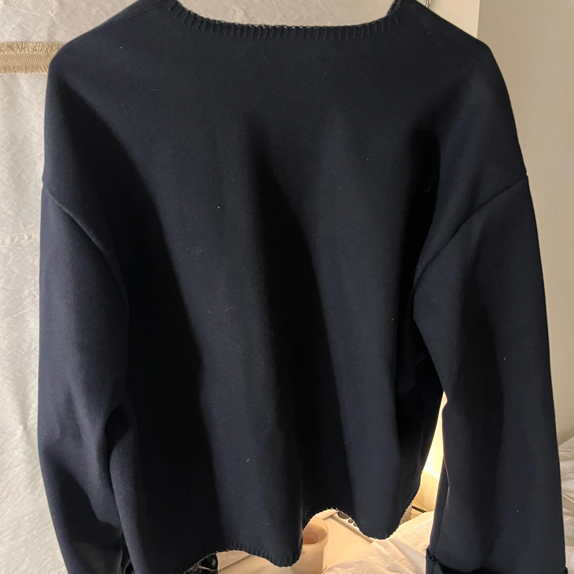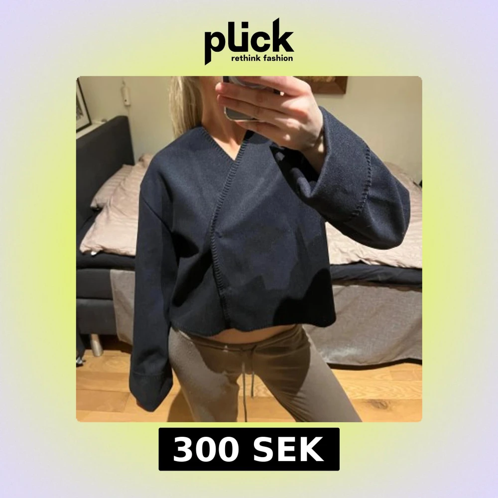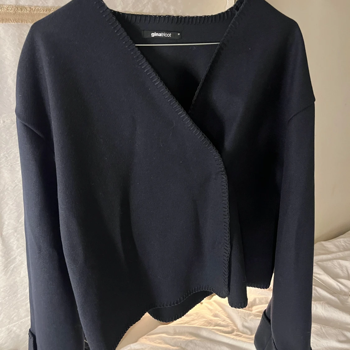 Snygg marinblå omlott tröja från Gina Tricot i storlek M. Tröjan har en stilren design med långa ärmar och en v-ringad hals. Perfekt för en trendig look.