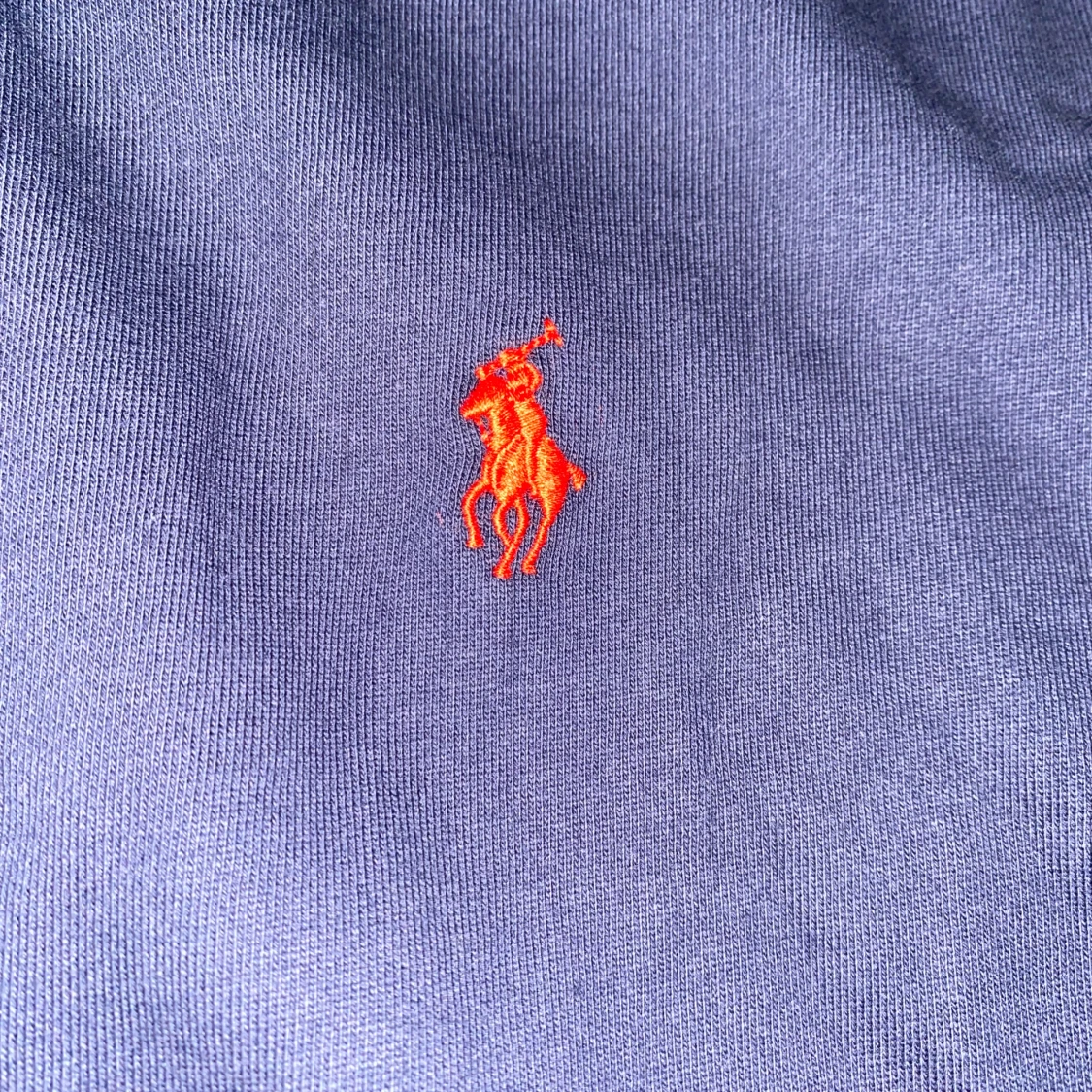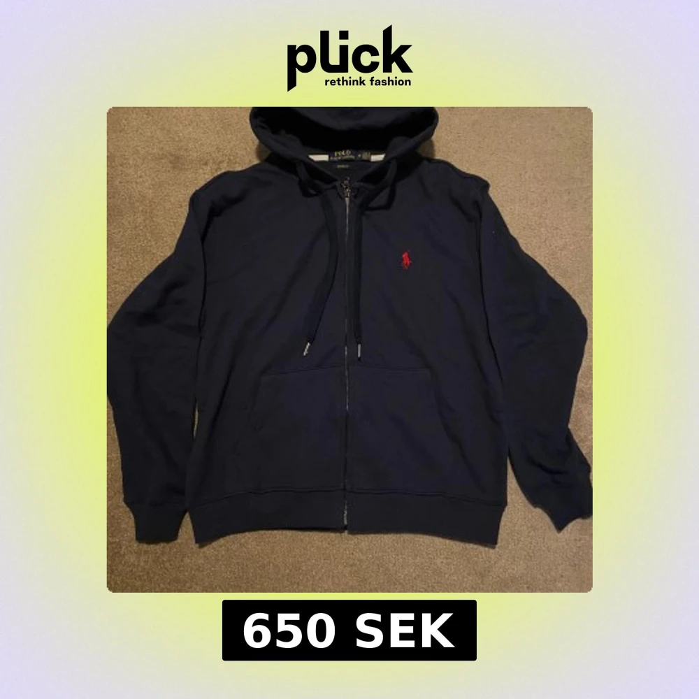 Marinblå hoodie med dragkedja och röd logotyp på bröstet. Modellen är "Custom Fit". Använd 4 gånger, tvättad i efterhand