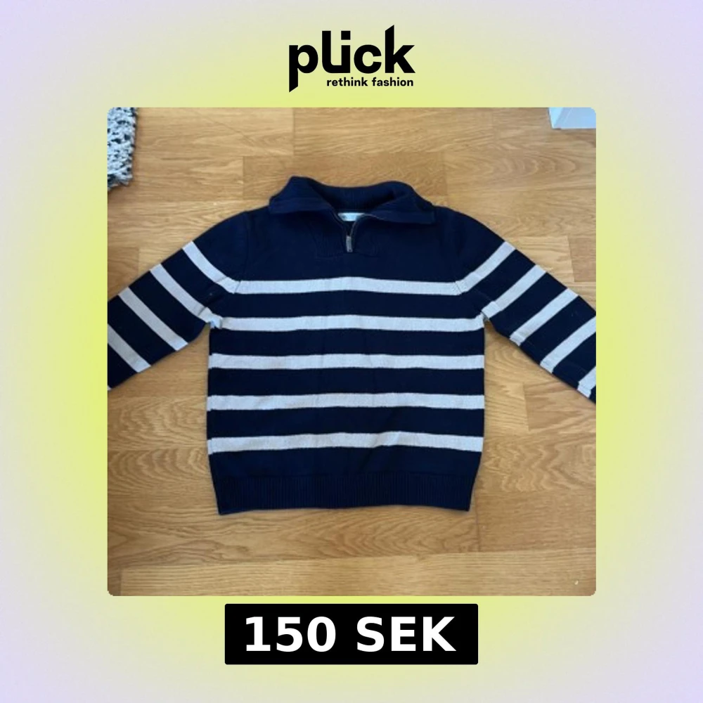 Snygg stickad tröja från Zara i marinblått med vita horisontella ränder. Tröjan har en hög krage med half zip-dragkedja och långa ärmar. Perfekt för dig som gillar klassisk stil med en modern twist.