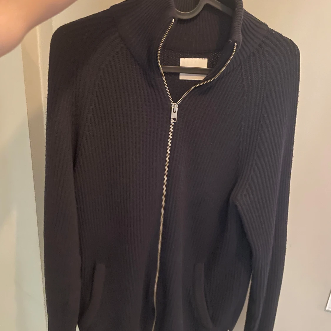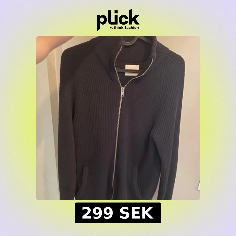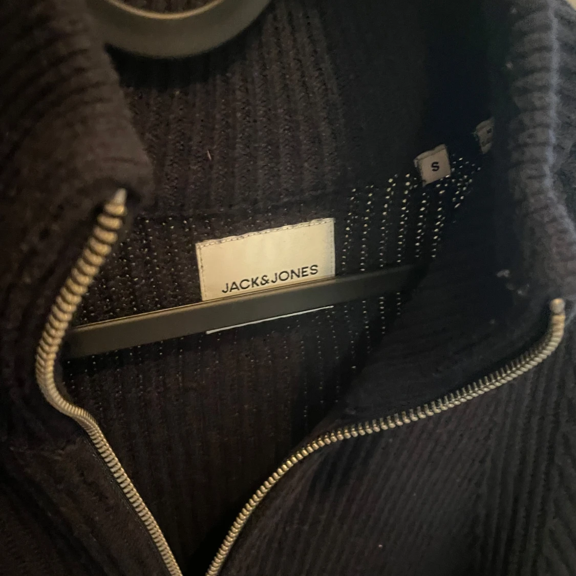 Säljer en stickad kofta från Jack & Jones i storlek S. Koftan har hel dragkedja framtill, hög krage och två fickor. Den är ribbstickad och har långa ärmar, perfekt för kyliga dagar.