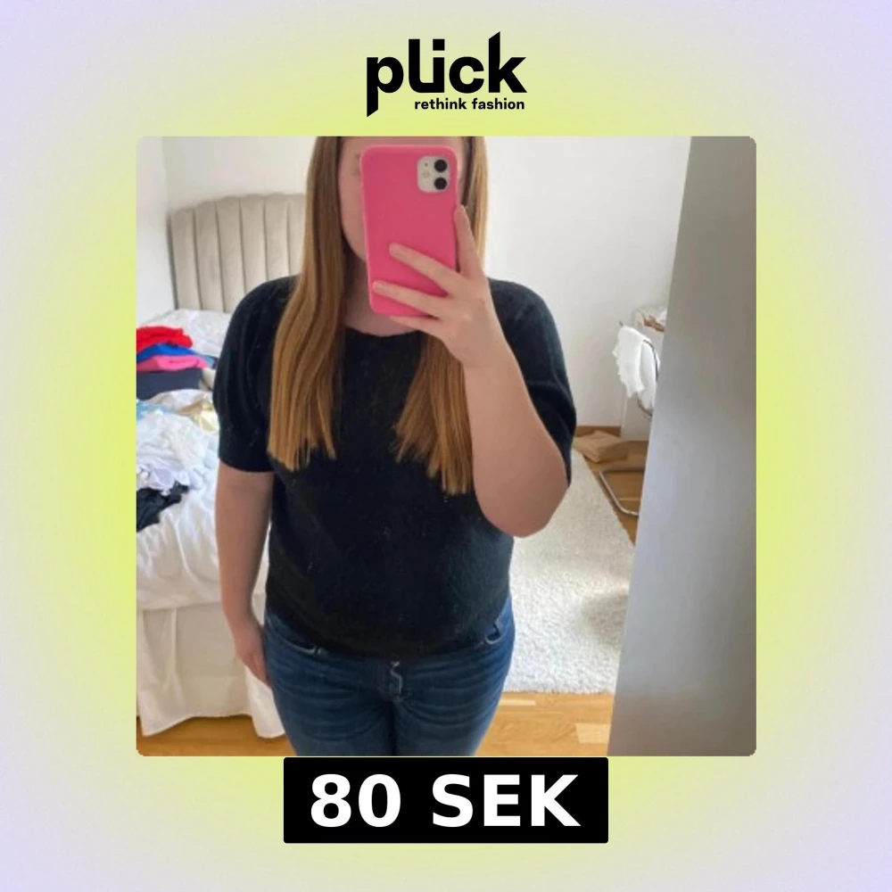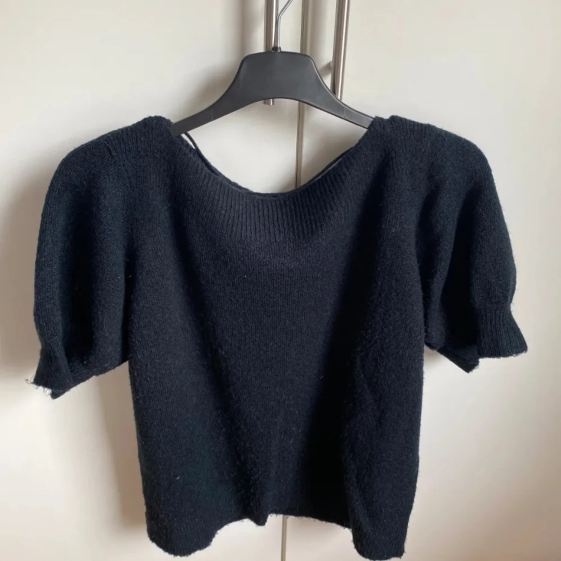 Marinblå stickad tröja med korta ärmar och rund halsringning. Modellen är lite loose och passar perfekt till jeans eller kjol. Mjuk och skön känsla, enkel att styla för en chill look. Den är lite nopprig (se bild 3)