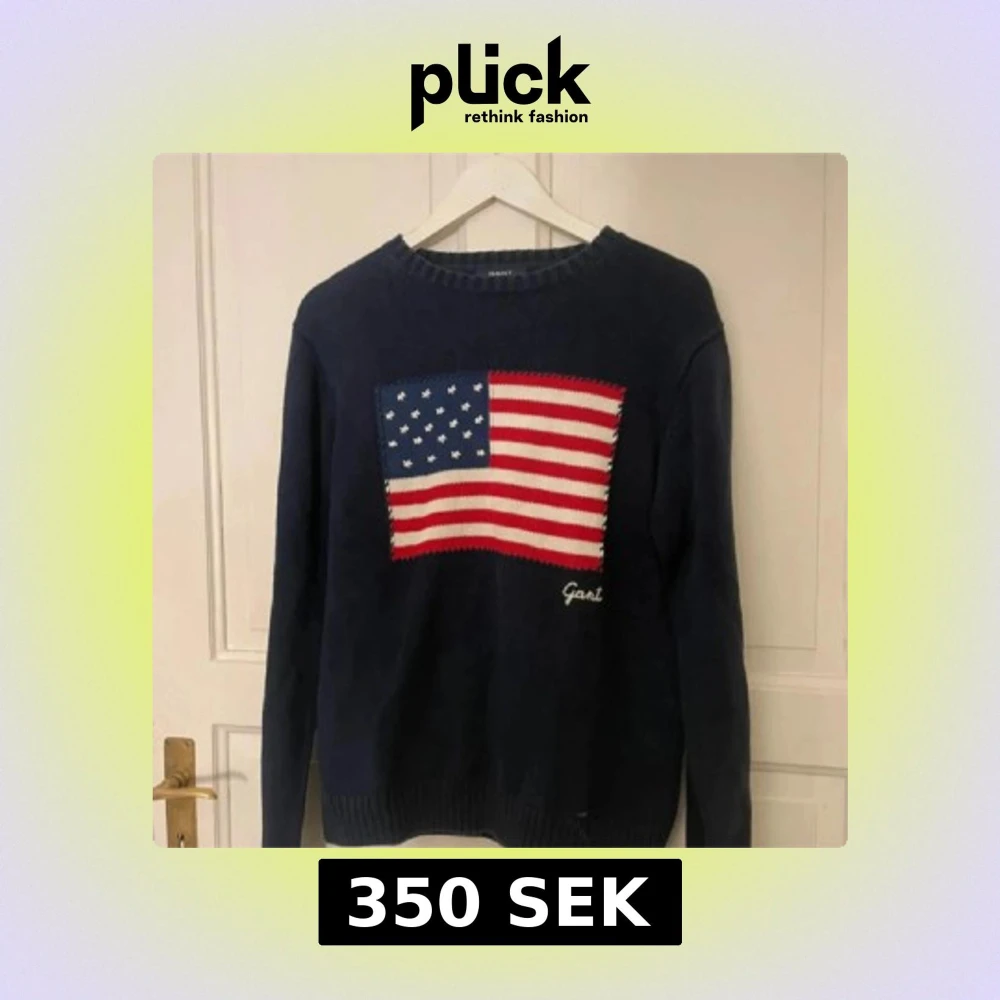 Snygg marinblå stickad tröja från Gant med amerikansk flagga i rött, vitt och blått på bröstet. Rund hals och långa ärmar, perfekt för dig som gillar klassisk preppy stil. Gant-logga broderad under flaggan.