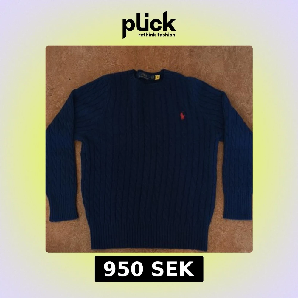 Säljer en marinblå stickad tröja från Polo Ralph Lauren med klassiskt kabelstickat mönster och röd broderad logga på bröstet. Tröjan har rund hals, långa ärmar och ribbade muddar vid ärmslut och nederkant. Perfekt för dig som gillar stilren och tidlös design. Storlek :S-XS