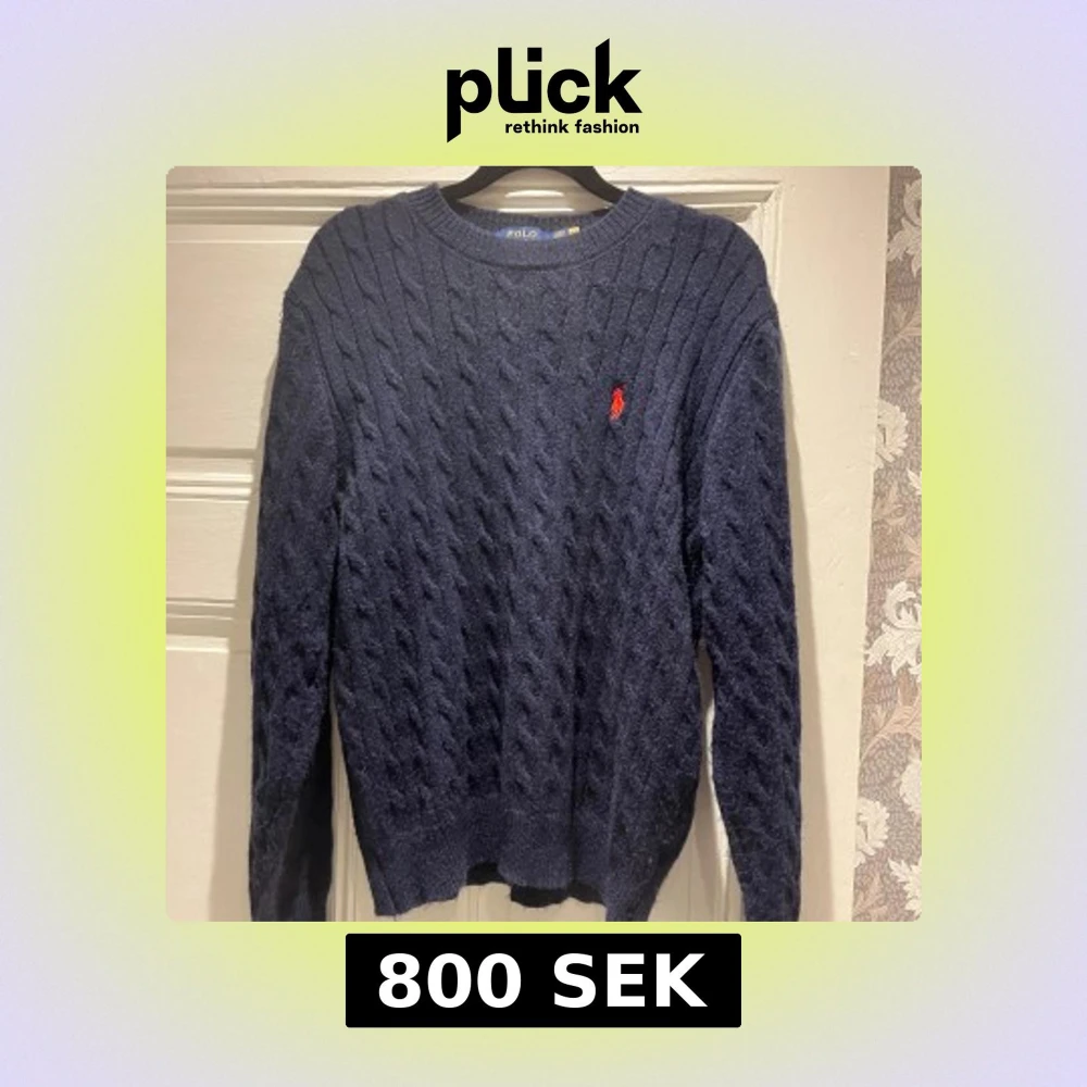 Säljer en marinblå stickad tröja från Polo Ralph Lauren med klassiskt kabelstickat mönster och röd broderad logga på bröstet. Tröjan har rund hals och långa ärmar, perfekt för kyliga dagar.