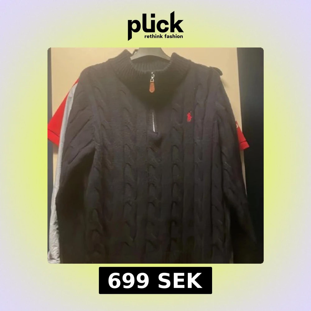 Säljer en marinblå stickad tröja från Ralph Lauren med dragkedja vid halsen och ett rött broderat märke på bröstet. Perfekt för kyliga dagar med sin kabelstickade design och höga krage.