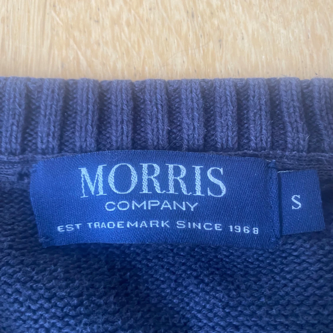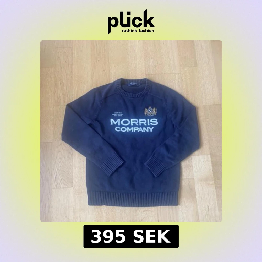 Snygg marinblå stickad tröja från Morris Company i storlek S. Tröjan har vit logotyp och broderat emblem på bröstet, samt ribbade muddar vid hals, ärmslut och nederkant. Perfekt för dig som gillar klassisk stil med en modern touch.