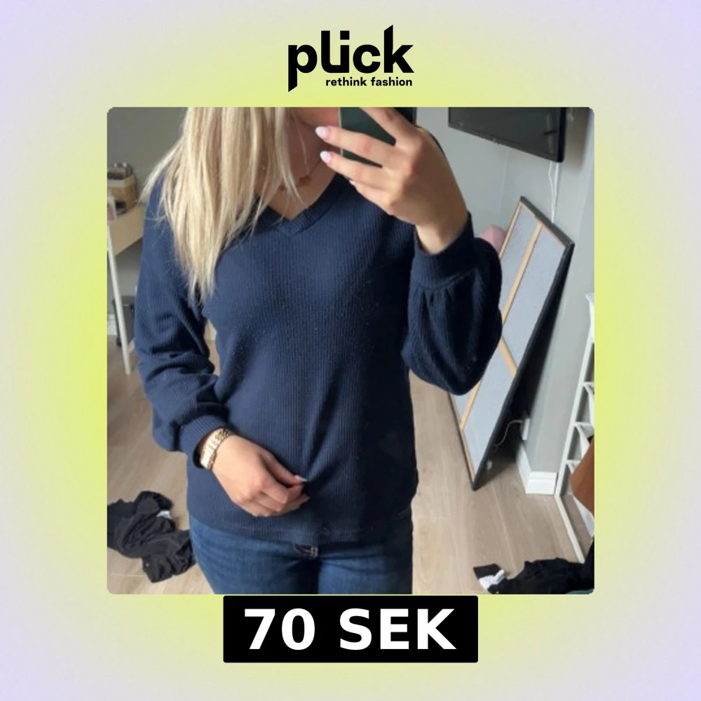 Säljer en marinblå stickad tröja med v-ringning och långa ärmar. Tröjan har en lätt ribbad struktur och är i en normal passform, perfekt att matcha med jeans. Perfekt till hösten🥰
