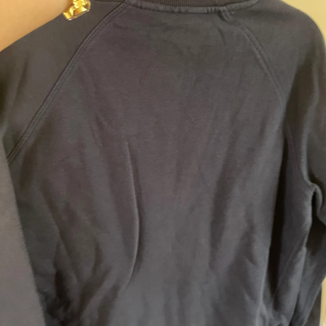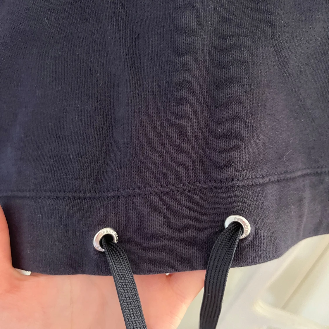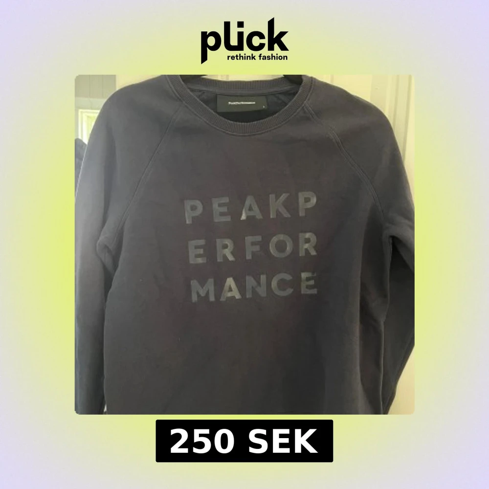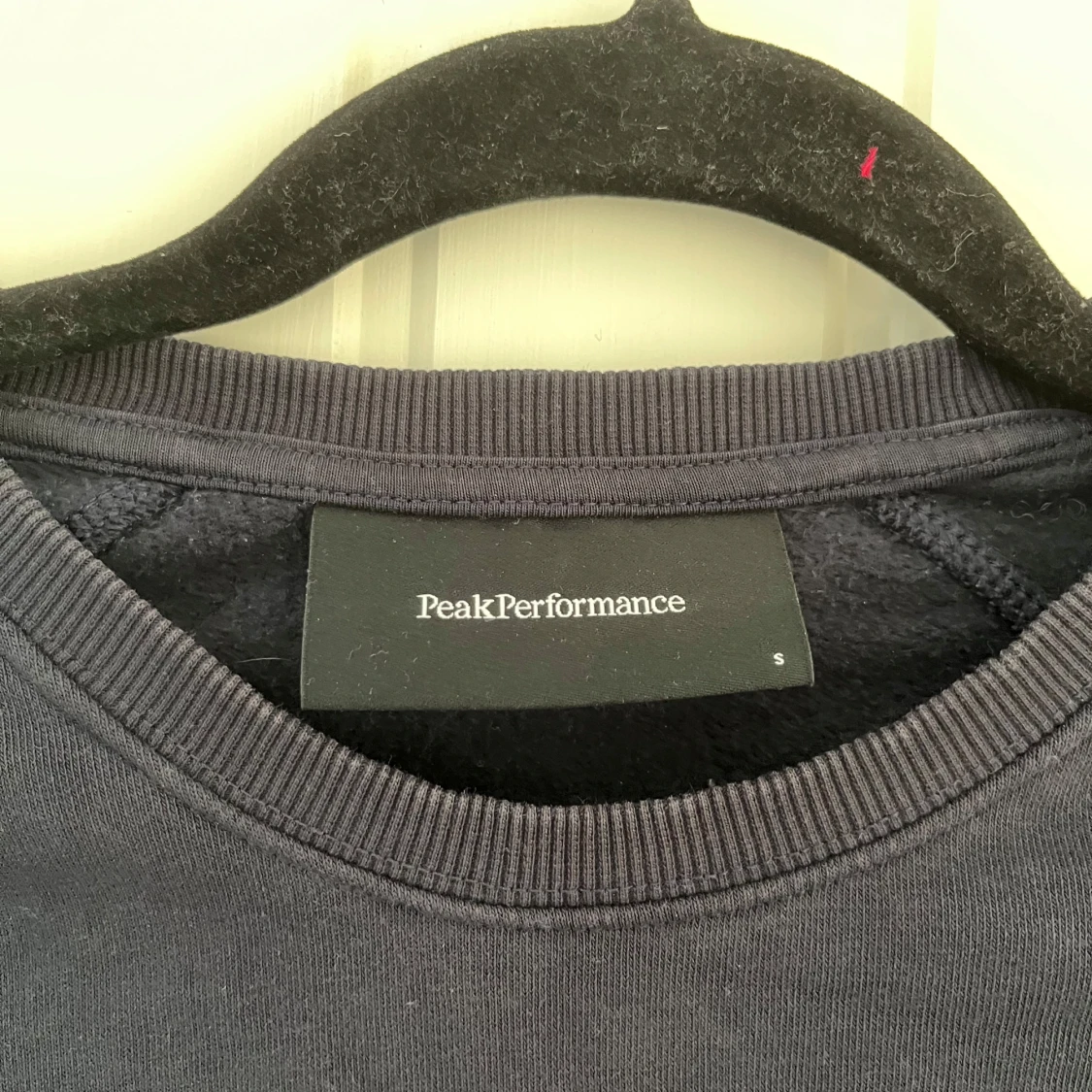 Säljer en stilren marinblå sweatshirt från Peak Performance med tryck på framsidan. Tröjan har långa ärmar och en rund halsringning. Den är försedd med snörning i nederkanten för justerbar passform. Perfekt för en avslappnad look. Liten i storleken