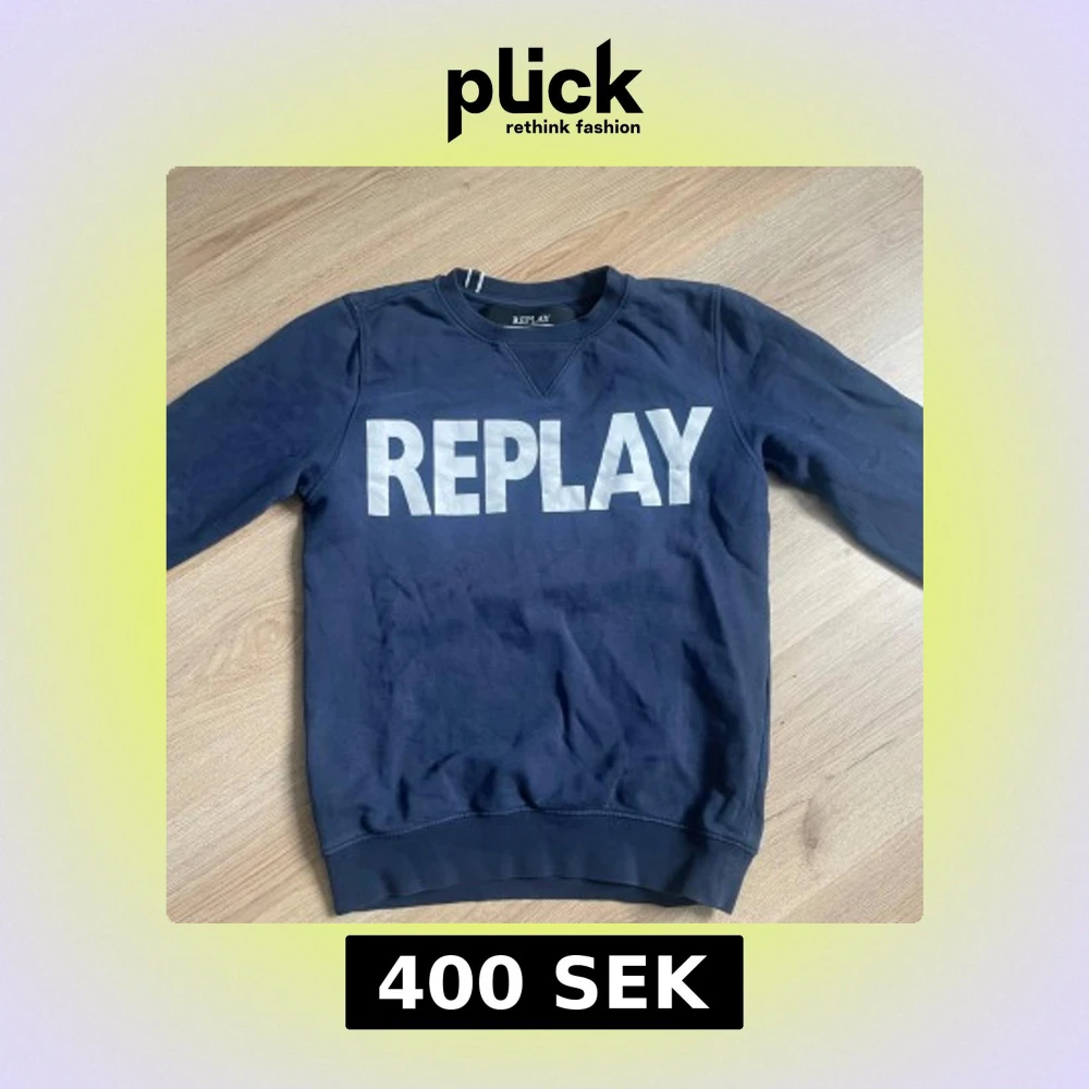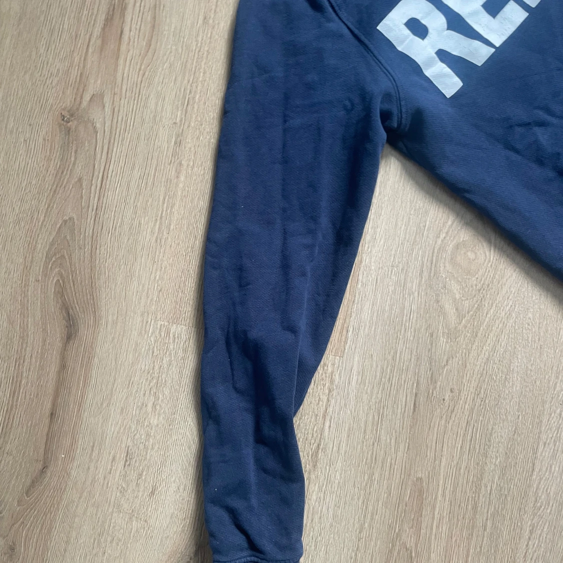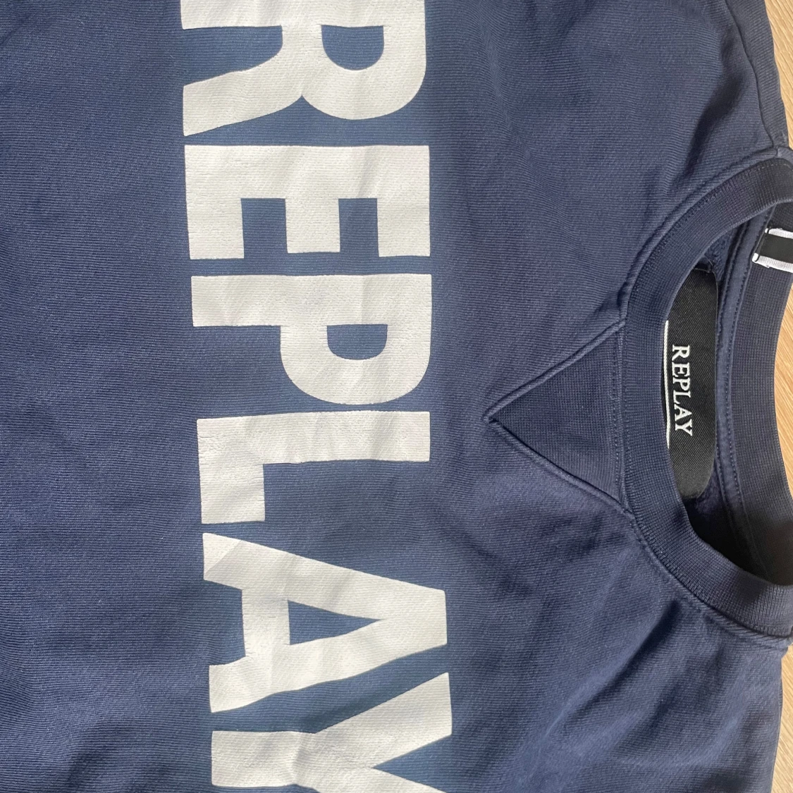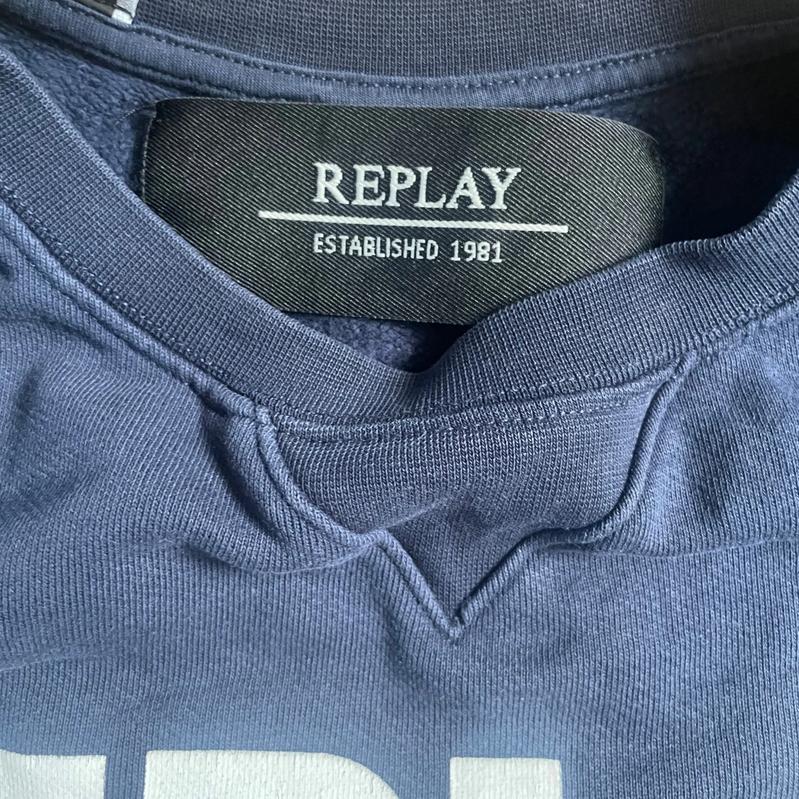 Snygg marinblå sweatshirt från Replay med stort vitt tryck över bröstet. Tröjan har rund hals, långa ärmar och ribbade muddar vid ärmslut och nederkant. Perfekt för dig som gillar streetwear och vill ha en enkel men stilren look.