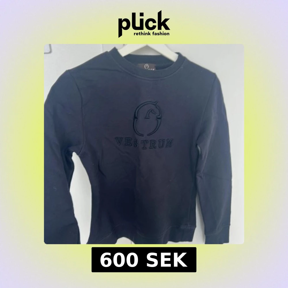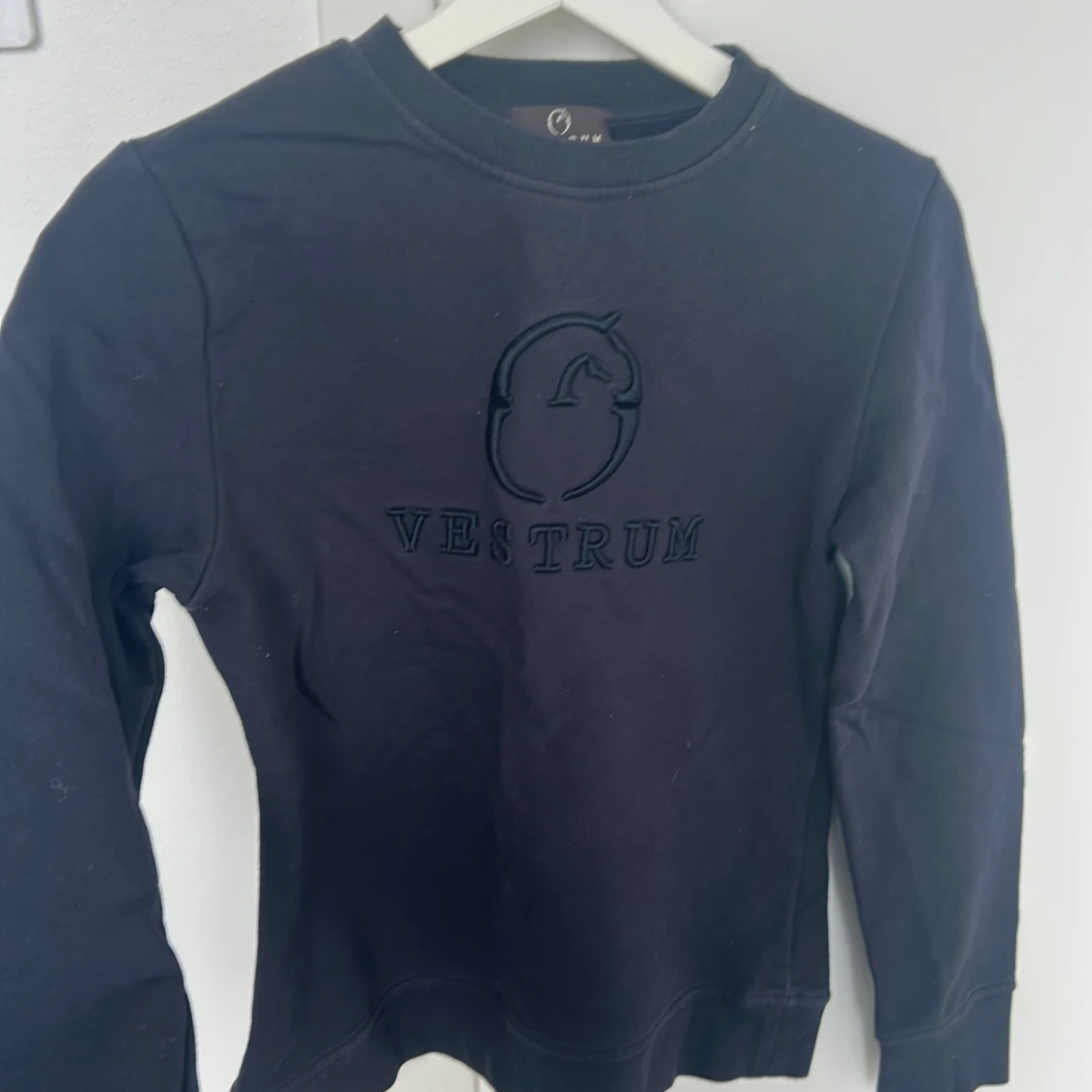 Marinblå sweatshirt från Vestrum med broderad logga och hästmotiv på bröstet. Storlek XS. Inte mycket använd.