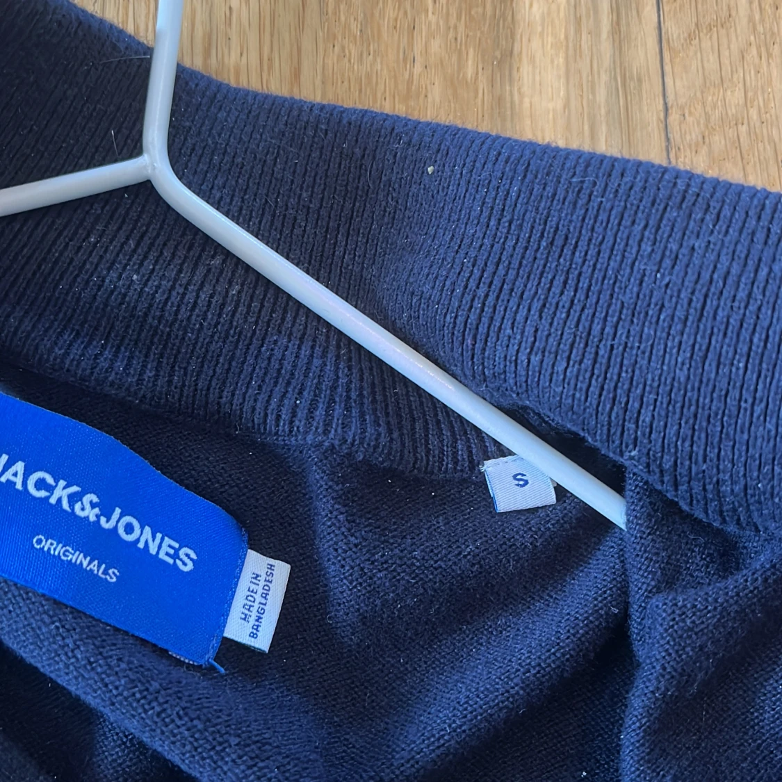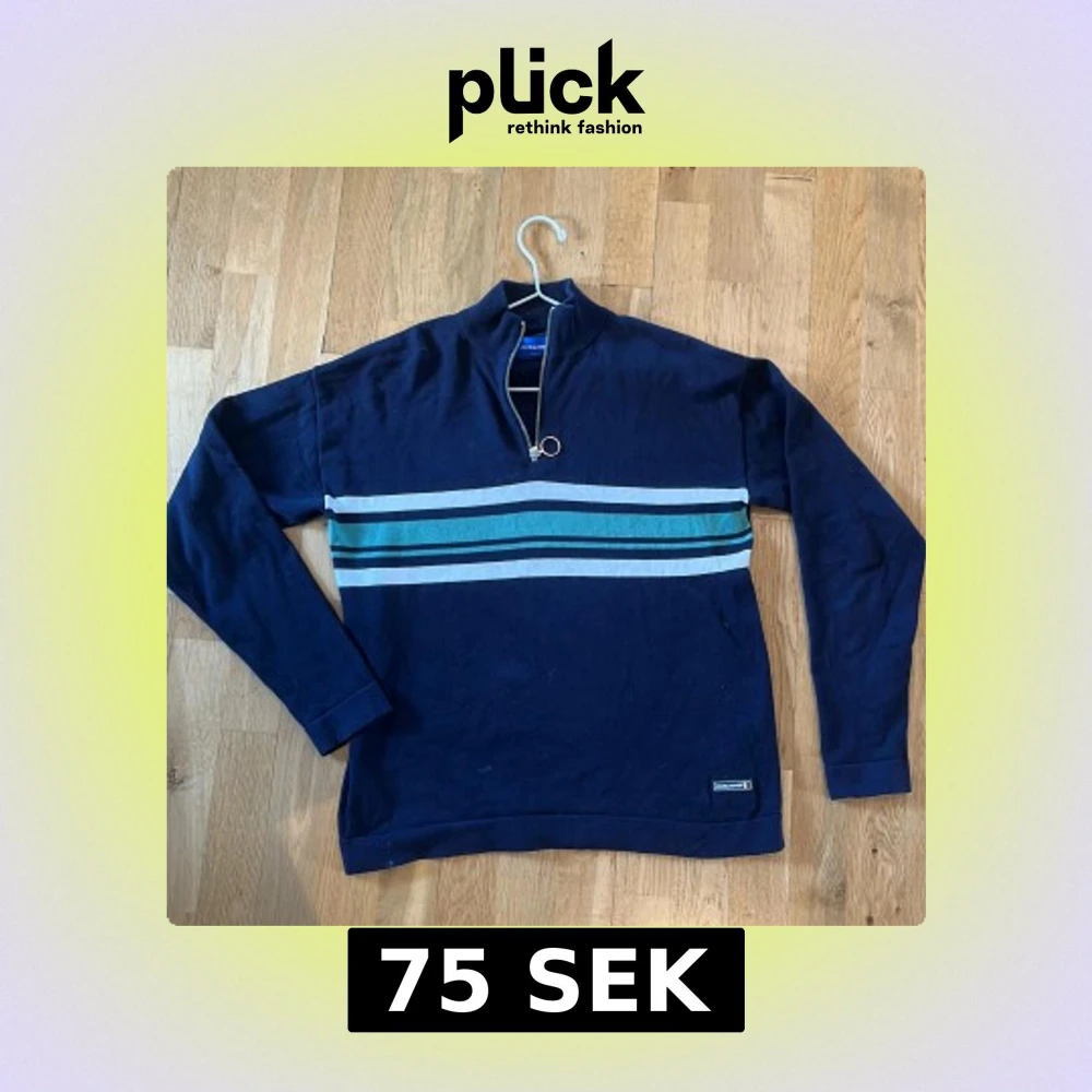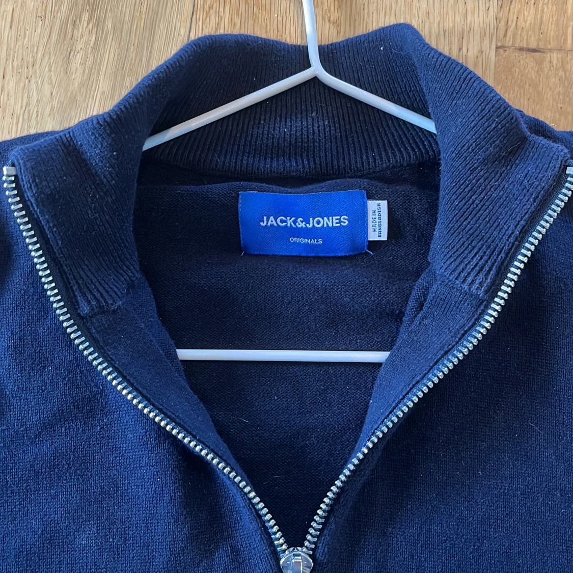 Säljer en marinblå långärmad tröja från Jack & Jones med halv dragkedja och ringdetalj. Tröjan har blå, grå och gröna ränder över bröstet. Perfekt för en avslappnad stil och passar till många tillfällen.