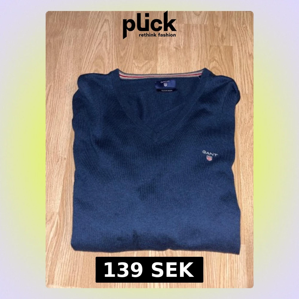 Snygg marinblå v-ringad tröja från GANT i storlek L men passar bättre M. Tröjan är tillverkad i en mjuk blandning av bomull och ull, har långa ärmar och ribbade muddar. Diskret GANT-logo broderad på bröstet och en cool randig detalj i kragen.