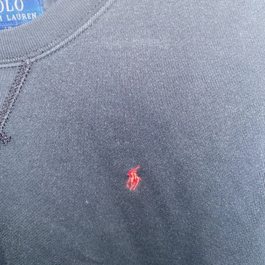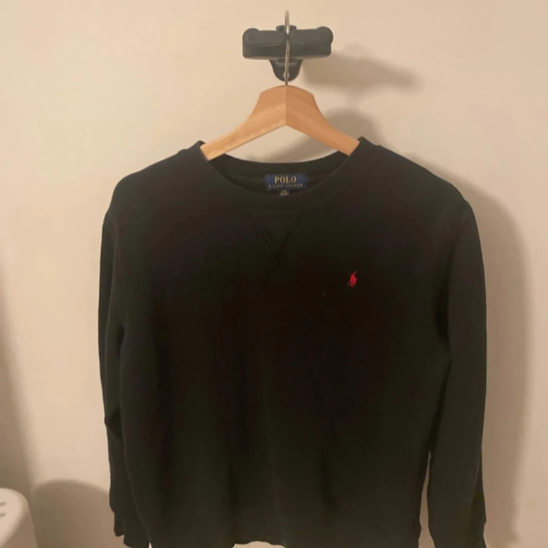 Säljer en klassisk svart tröja från Polo Ralph Lauren med det ikoniska röda broderade logotypen på bröstet. Tröjan har långa ärmar och en rund halsringning. Perfekt för en stilren och avslappnad look. Lite små fläckar på mudrarna men för priset så finns det inget att klaga på😁 pris kan diskuteras