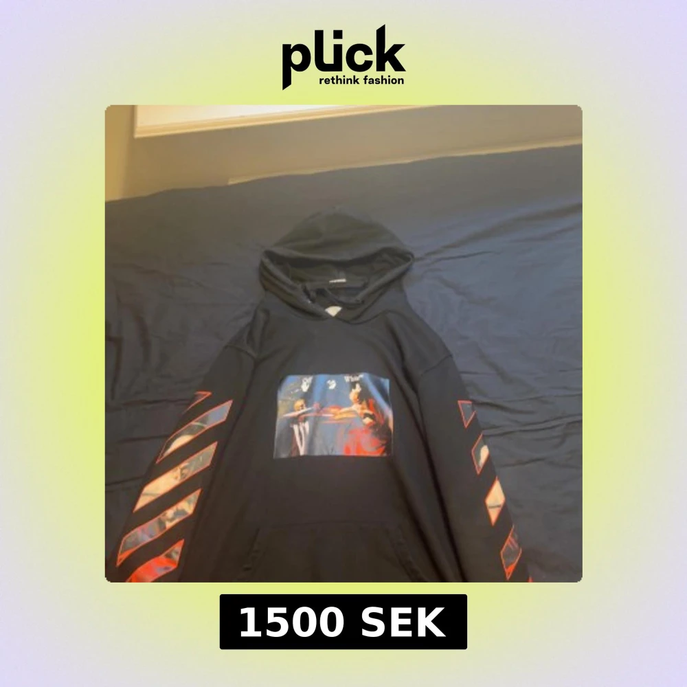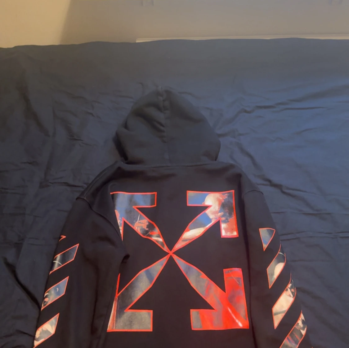 Svart hoodie från Off-White med stor grafisk print på ryggen och färgstarkt motiv på bröstet. Ärmarna har röda och vita diagonala ränder. Klassisk huva och känguruficka framtill. Perfekt för dig som gillar streetwear och vill sticka ut.