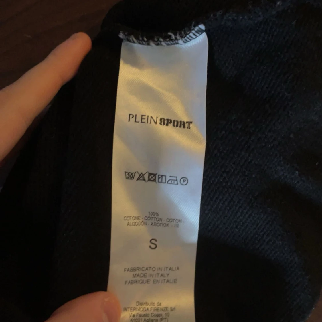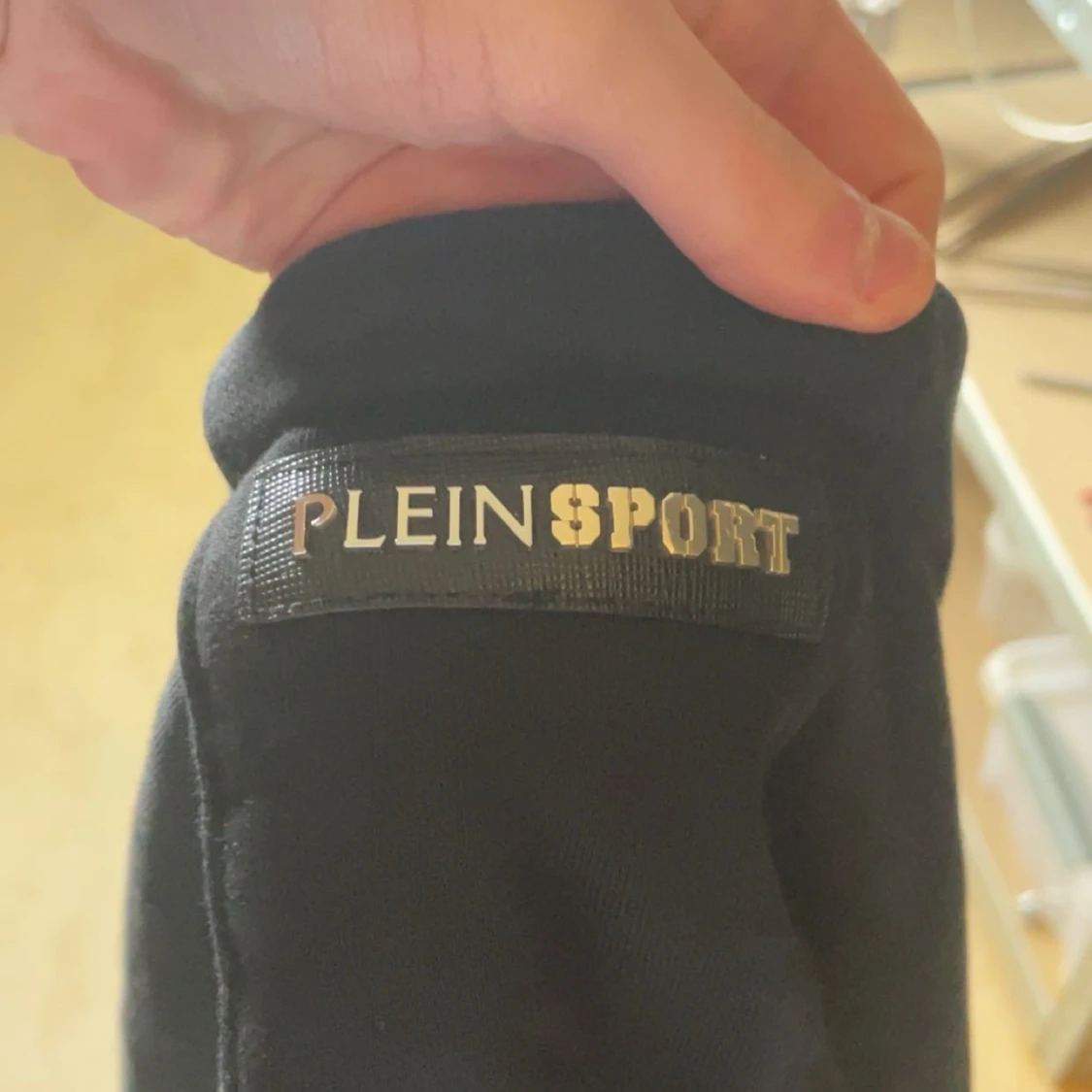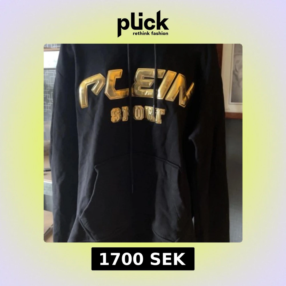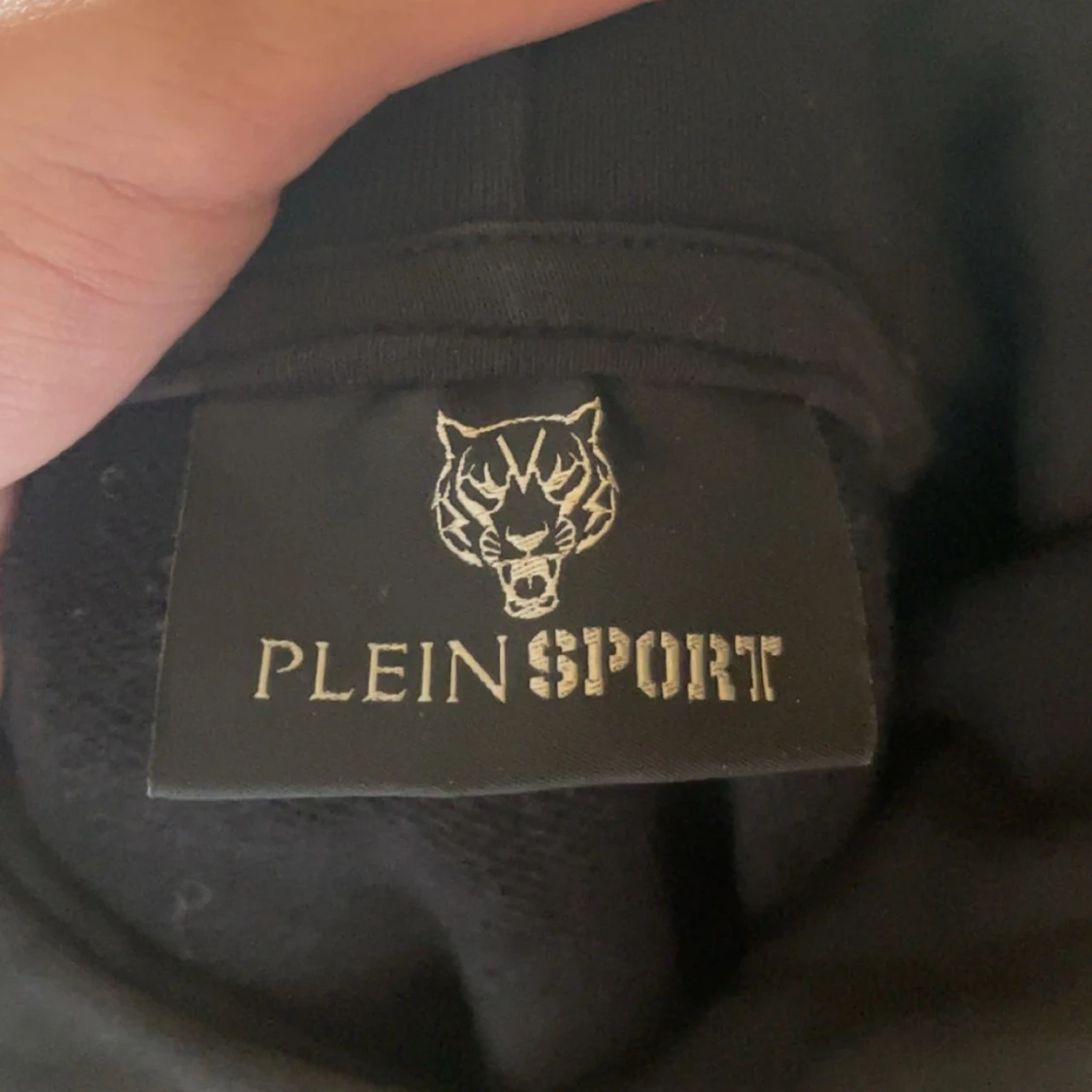 Snygg svart hoodie från Plein Sport med guldtryck på bröstet. Tillverkad i bomull för en bekväm känsla. Perfekt för en sportig look med stil. Ny skick använd sparsamt