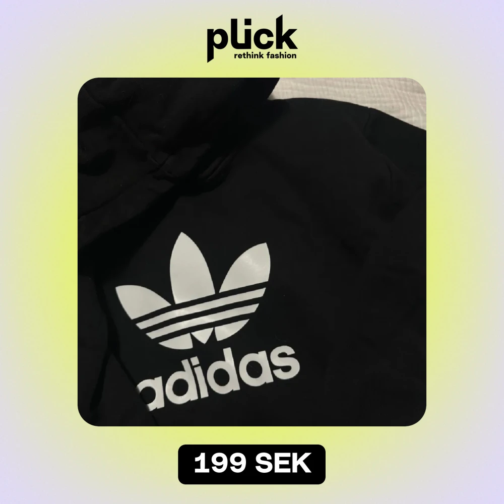 Säljer en svart hoodie från Adidas med den klassiska trefoil-loggan i vitt på bröstet. Perfekt för en casual look eller träning. Den har en justerbar huva och en stor ficka framtill. Superbekväm och stilren!