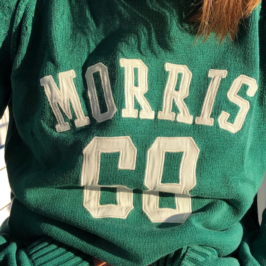 Grön stickad tröja med vit text från Morris köpt på herravdelningen!🌵